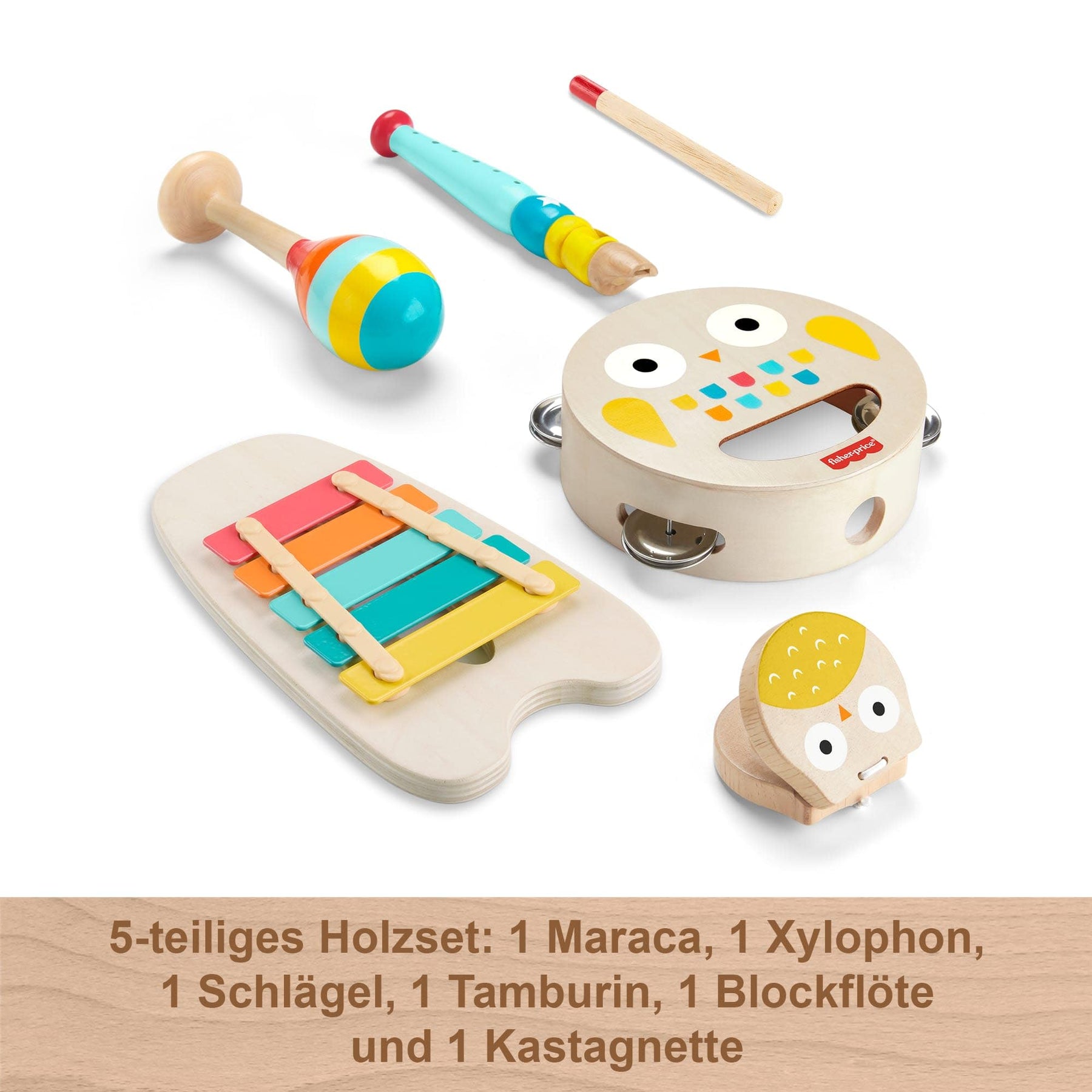 Mit diesem Musik-Geschenkset von Fisher-Price können Kleinkinder ihre eigenen Jam-Sessions veranstalten. Dieses Set mit Spielzeuginstrumenten aus Holz enthält eine Maraca, ein Xylophon mit Schlägel, ein Tamburin, eine Blockflöte und eine Kastagnette, die in hellen Farben gestaltet sind und Tiergesichter haben, um die Kreativität von Kindern anzuregen. Und wenn mehr als ein Instrument vorhanden ist, können auch Geschwister und Freunde am Spielspaß teilhaben. Aus Holz aus nachhaltiger, FSC-zertifizierter Waldwirtschaft.