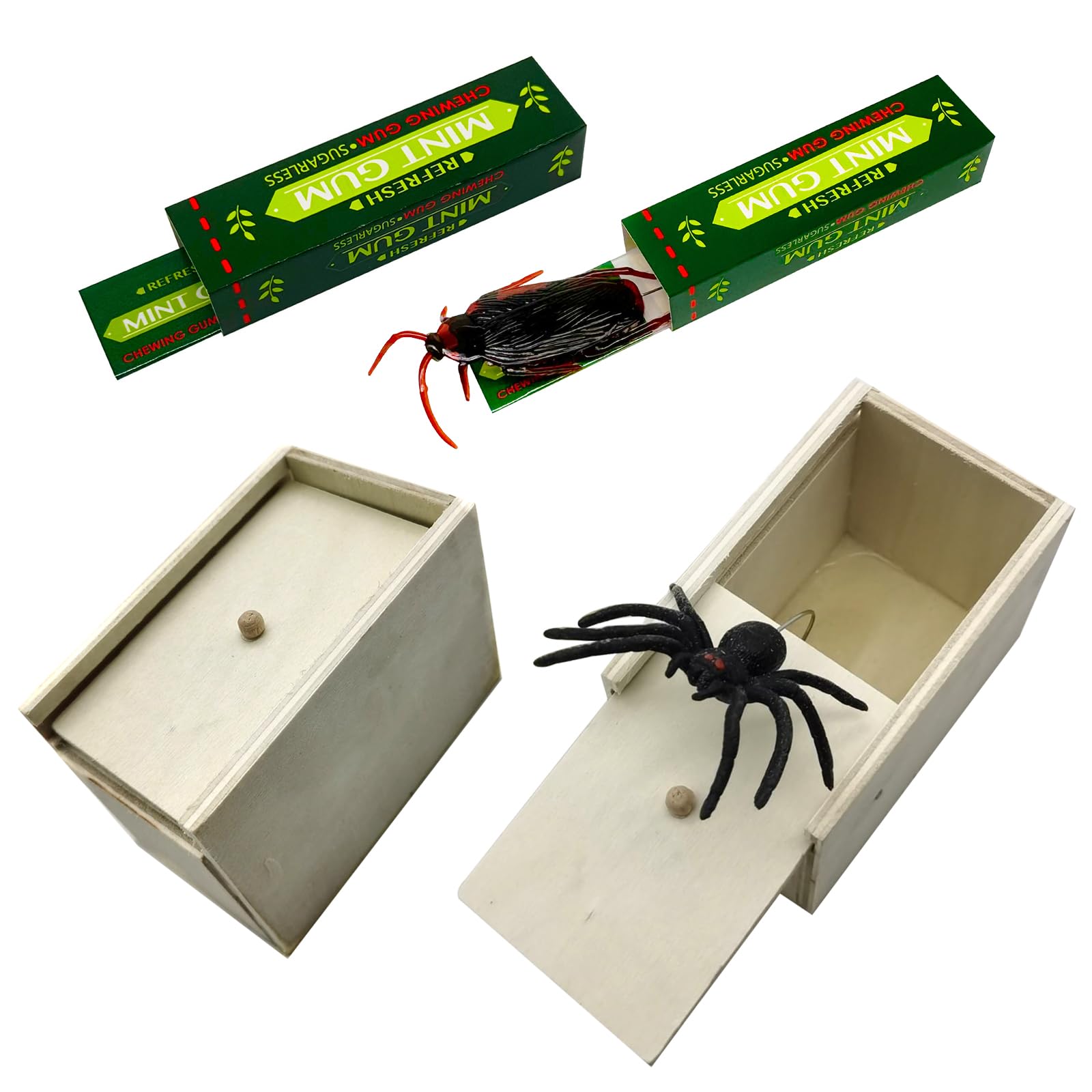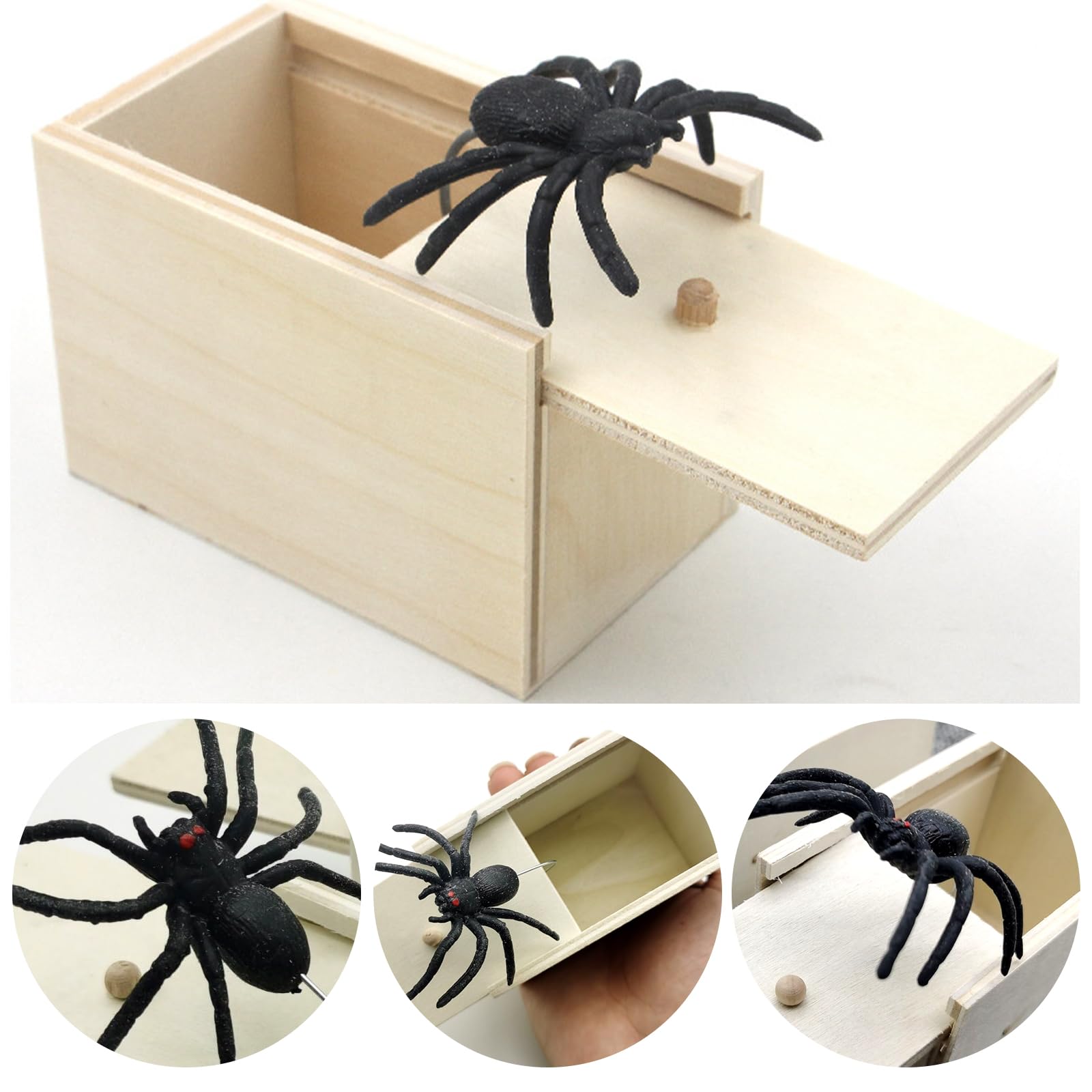 • Spinnen Prank Box: Holzkiste mit lebendiger, naturgetreuer Eine spinne aus weichem gummi, deren beine zucken, sobald sie herausspringt, und die bei berührung mit der hand gruselig und realistisch wirkt. Perfekt für Streiche.