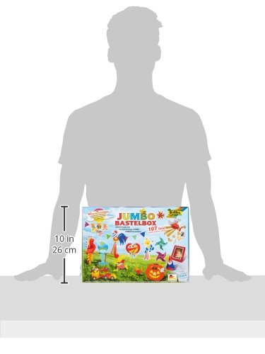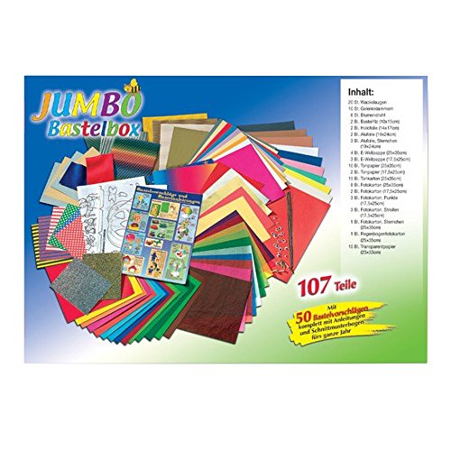 Die Jumbo Bastelbox von Folia enthält eine riesige Auswahl aktueller Bastelmaterialien. Die bedruckte Faltschachtel mit Plastik-Tragegriff enthält insgesamt 107 Teile. Darunter befindet sich eine Vielzahl an verschiedenen Papiersorten wie Fotokarton in unterschiedlichen Motiven und Farben, Transparentpapier, Tonpapier, Wellpappe, Alufolie, Bastelfilz, Wackelaugen usw. Außerdem gibt es eine farbige Bastelanleitung, sowie einen Schnittmusterbogen und 50 Bastelvorschläge. Mit dem Bastelkoffer sind sie bestens gerüstet für zahlreiche Bastelstunden und -ideen.
