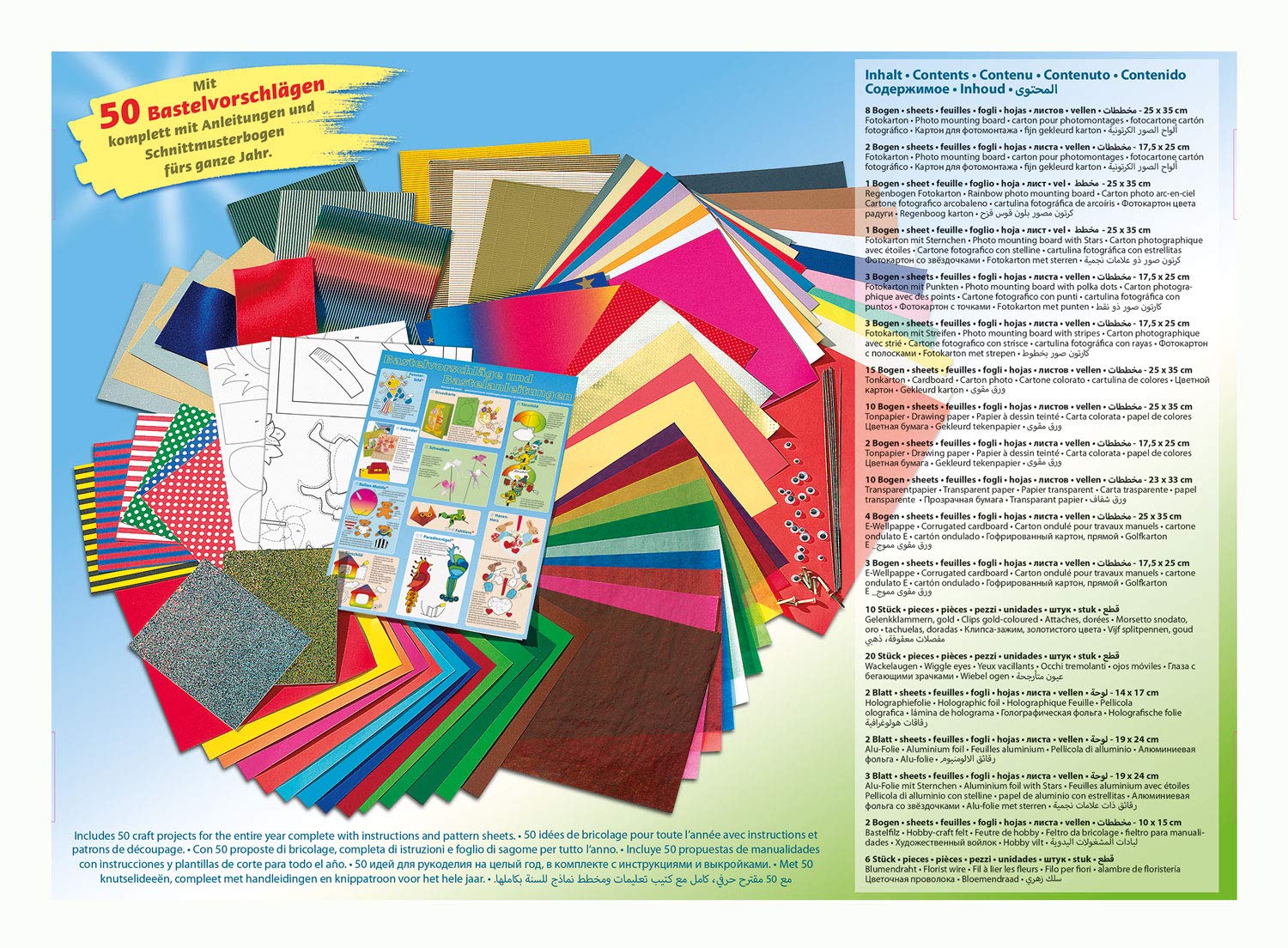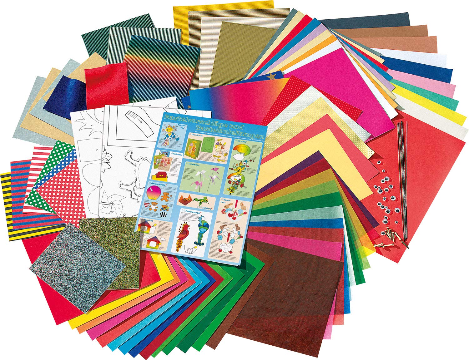 - Inhalt: Wackelaugen, Blumendraht, Bastelfilz, Alufolie, Wellpappe und viele andere Papiersorten
