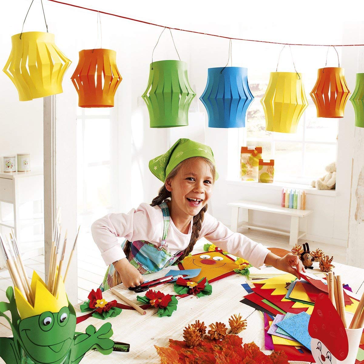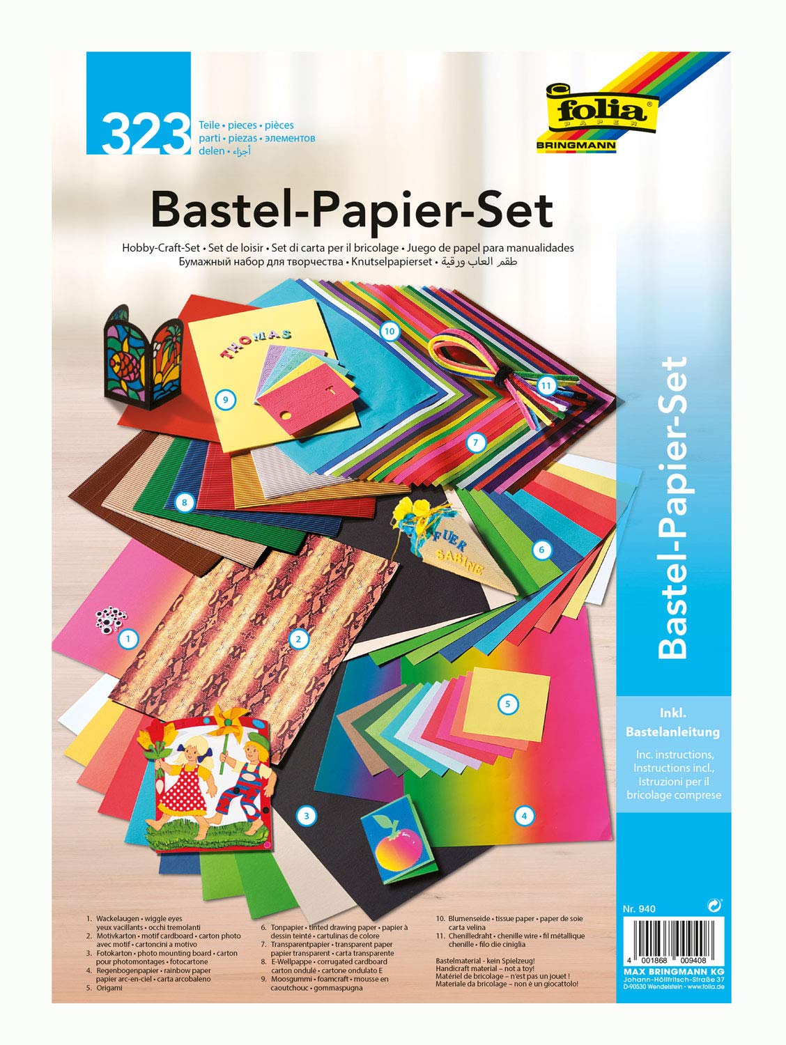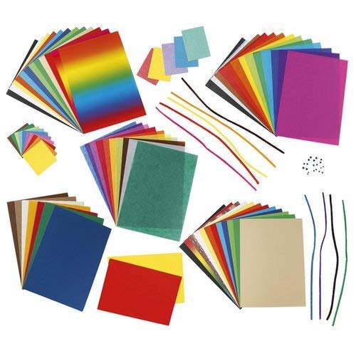 Einzelheiten: Das Bastelpapier-Set besteht aus vielen verschiedenen Bastelmaterialien. Insgesamt 323 Teile lassen die Herzen kreativer Köpfe höher schlagen. Der Inhalt besteht aus: 10 Blatt Tonkarton (220 g / qm, ca. 25 x 35 cm, farbig sortiert), 13 Blatt Tonpapier (130 g / qm, ca. 25 x 35 cm, farbig sortiert), 10 Blatt Transparentpapier (42 g / qm, ca. 25 x 35 cm, farbig sortiert), 11 Blatt E-Welle (ca. 25 x 35 cm, farbig sortiert), 1 Blatt Regenbogenfotokarton (300 g / qm, ca. 25 x 35 cm), 1 Blatt Motivkarton (250 g / qm, ca. 25 x 35 cm, Schlangenhaut), 13 Blatt Blumenseide (20 g / qm, ca. 25 x 35 cm), 2 Blatt Regenbogenpapier (100 g / qm, ca. 25 x 35 cm, Regenbogenverlauf), 2 Blatt Moosgummi (ca. 20 x 29 cm, farbig sortiert), 100 Blatt Origamifaltblätter (ca. 10 x 10 cm, farbig sortiert), 10 Stück Chenilledrähte (farbig sortiert) und 20 Wackelaugen in verschiedenen Größen sortiert. Bastelanleitungen sind ebenfalls mit enthalten.