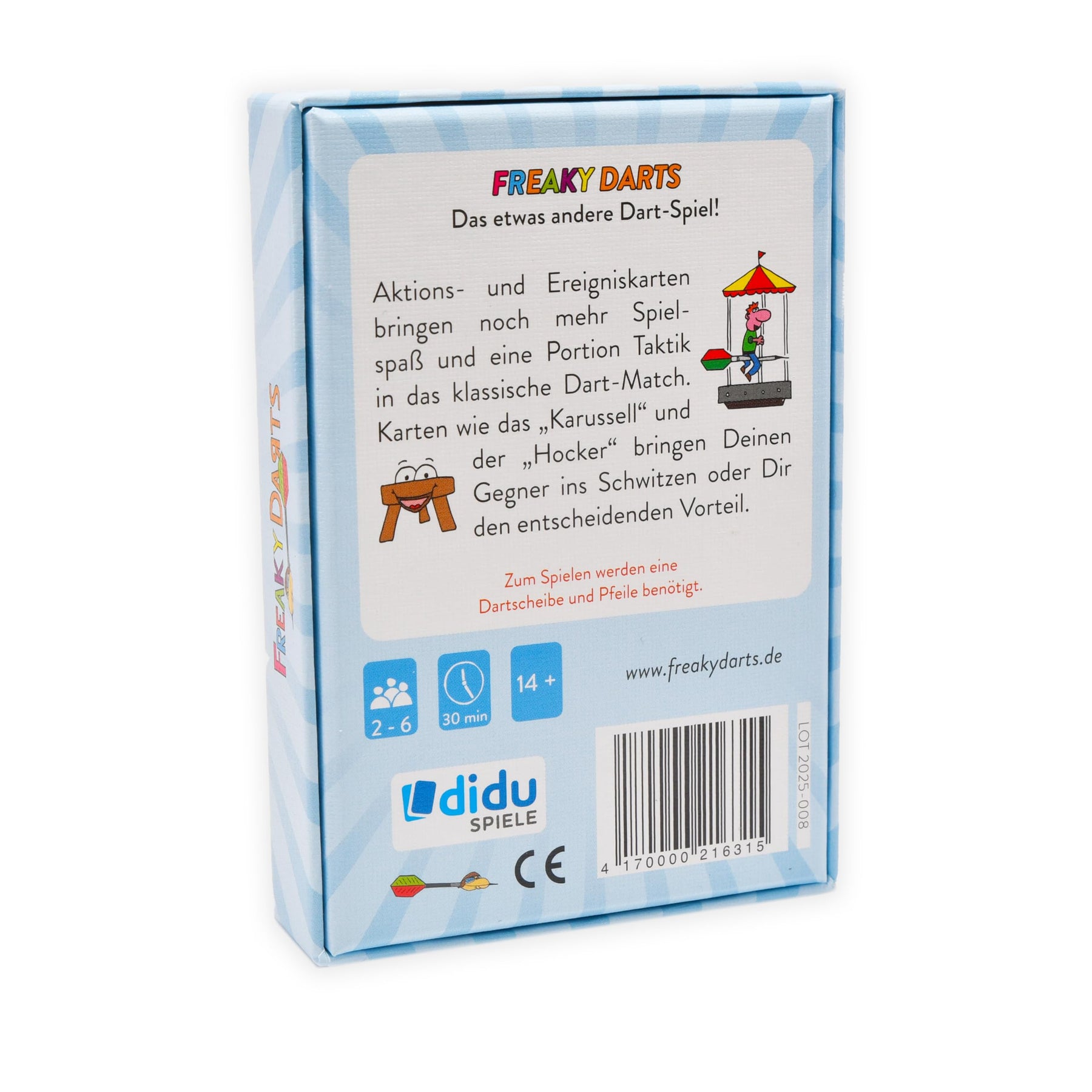 Kurz und knapp: Freaky Darts bringt noch mehr Spannung und eine Portion Taktik in das klassische Dartmatch Inhalt: 51 Spielkarten, Kurzanleitung, Sicherheitshinweis JETZT NEU: Im hochwertigen Spielekarton (Edition ab 2025) Kartenspiel für 2-6 Spieler*innen Empfohlen ab 14 Jahre Spieldauer: ca. 30min (je nach Variante) Zum Spielen werden eine Dartscheibe und Pfeile benötigt