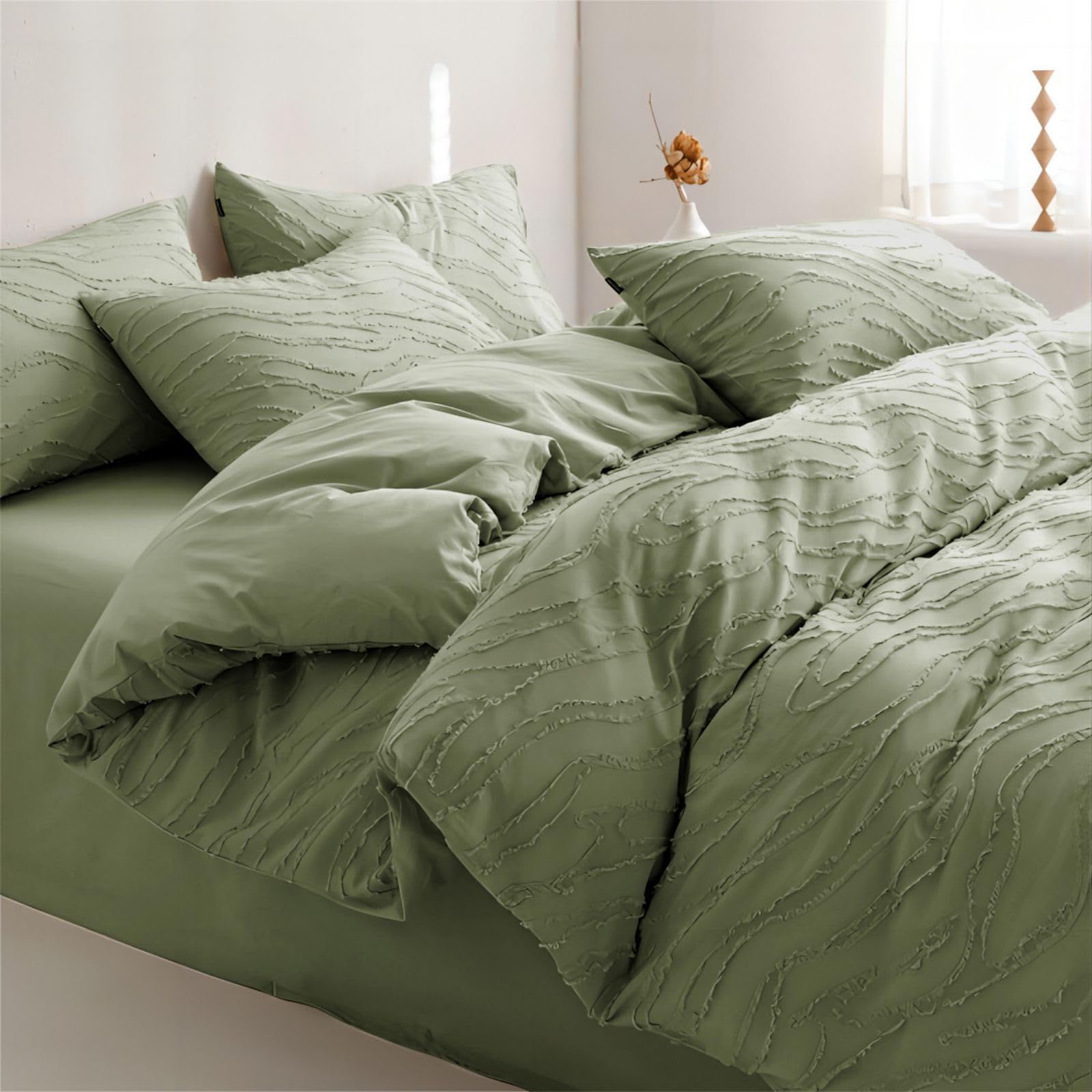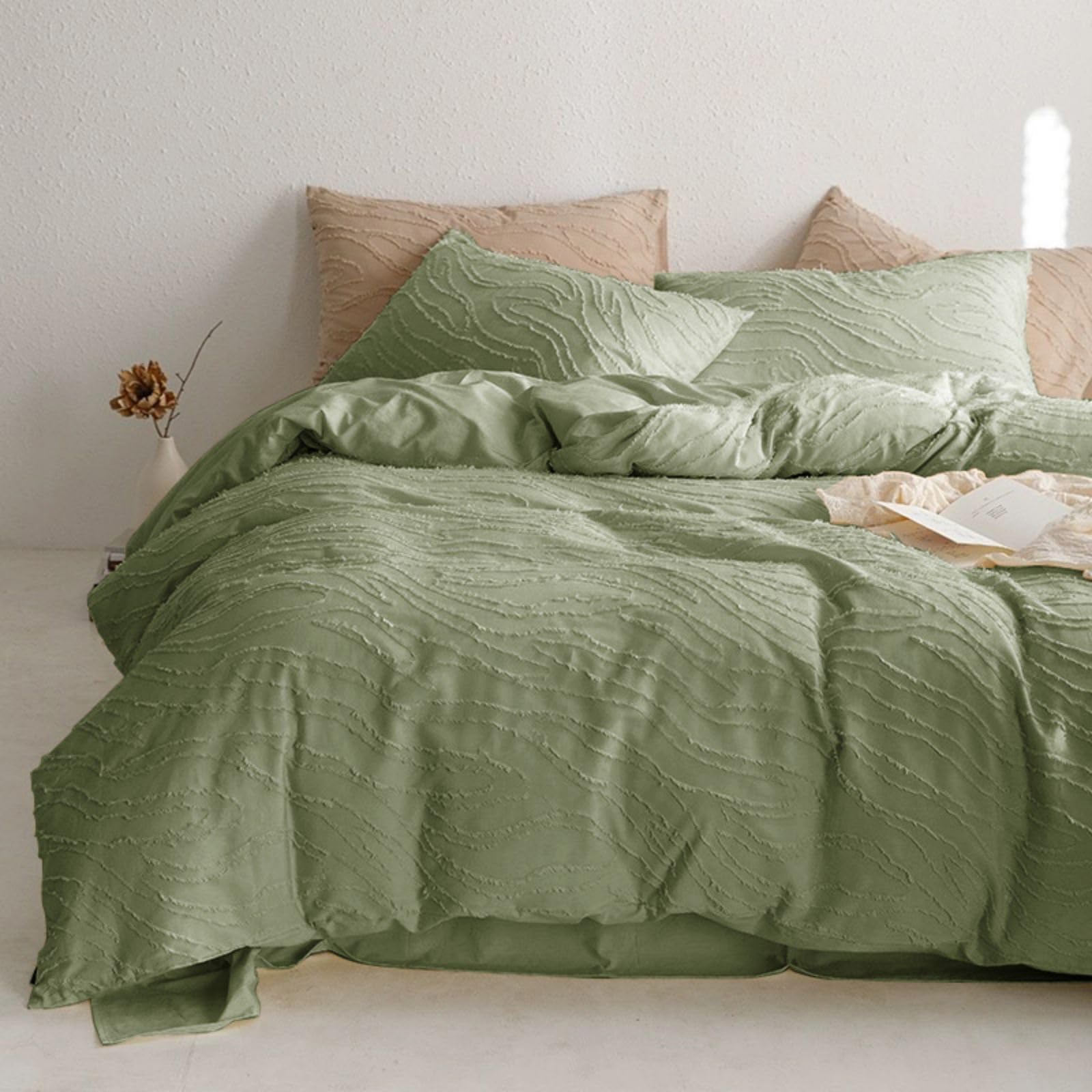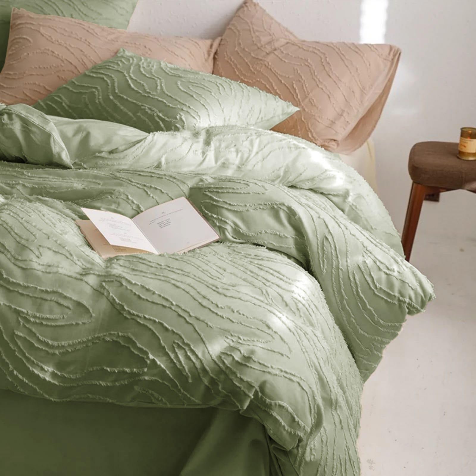 Freyamy Boho Bettwäsche 200x200cm 3teilig Grün Getuftet Böhmen Bettwäsche Stickerei Shabby Chic Bohemian Bettwaren-Sets 100% Microfaser Bettbezug mit Reißverschluss und 2 Kissenbezug 80x80cm