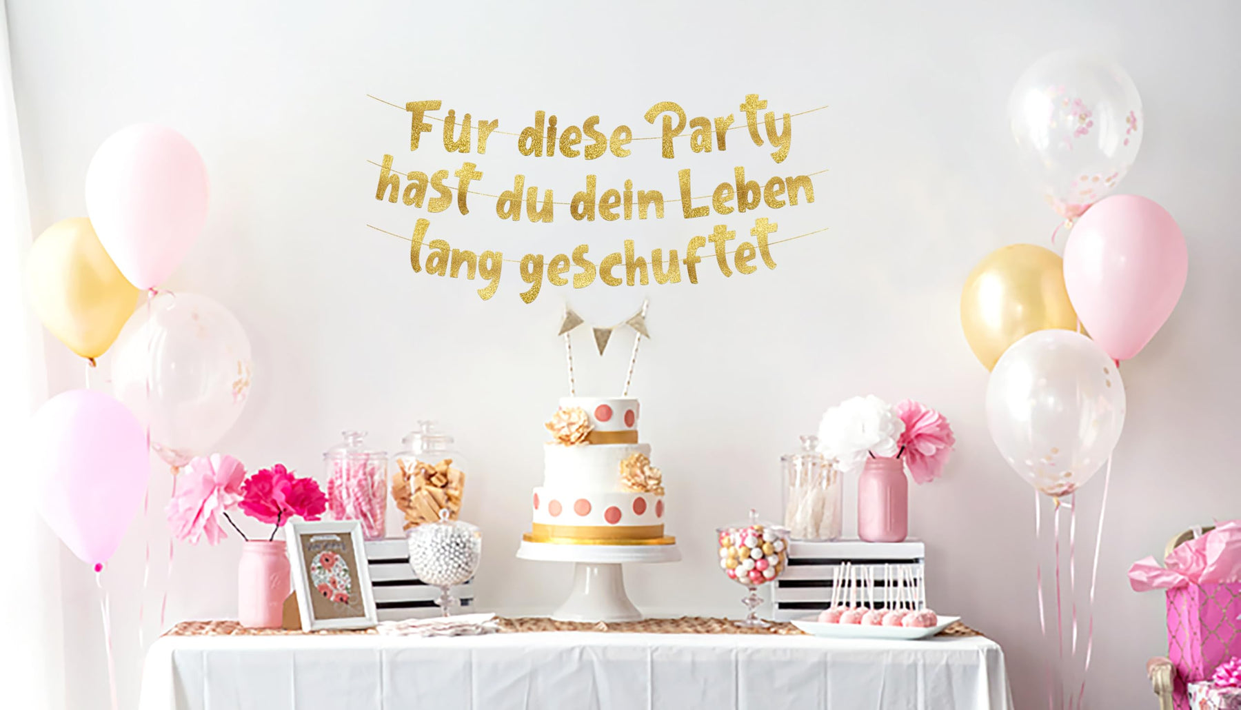 - Kompakte Größe – Mit ca. 1,4 m Länge ist das Banner kompakt und trotzdem ein echter Hingucker – ideal für über dem Buffet, an der Wand oder als Fotohintergrund.
