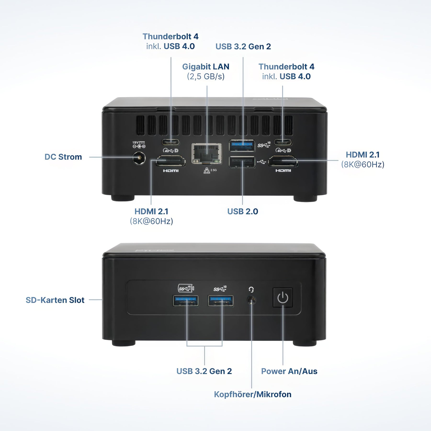 - ULTRASCHNELLE VERBINDUNGEN – Ausgestattet mit Intel Ethernet (2,5 Gbit/s), WiFi 6E und Bluetooth 5.3 bietet der Mini-PC höchste Übertragungsgeschwindigkeiten. Zwei Thunderbolt 4 Ports ermöglichen High-Speed-Datenübertragung und Docking. Ideal für Unternehmen, Entwickler, Medienproduktionen und mehr.