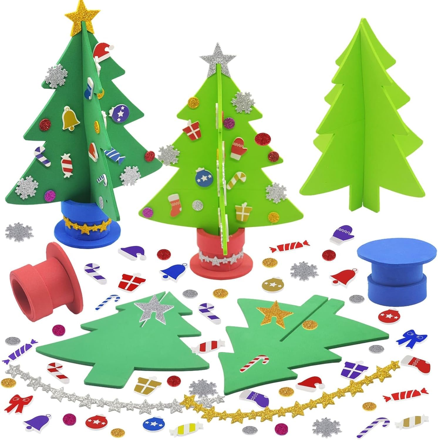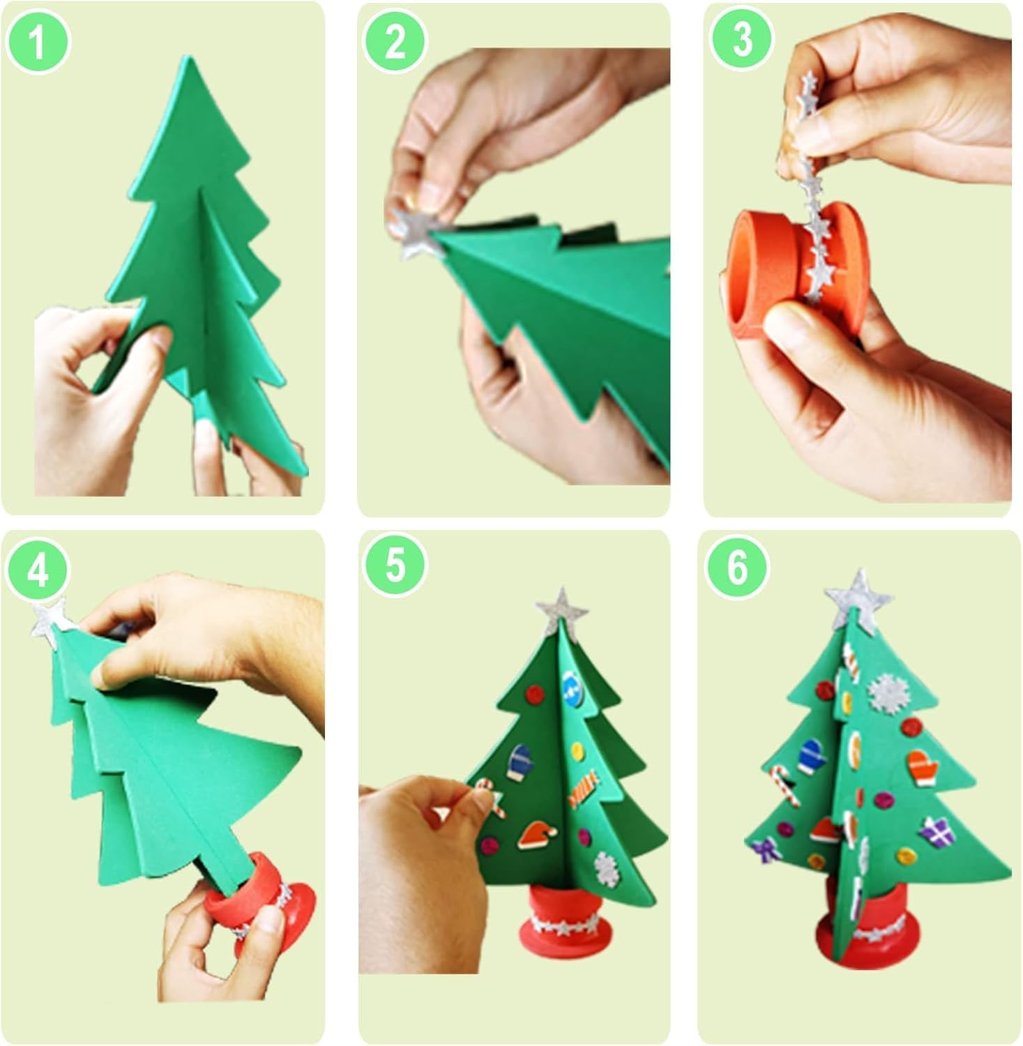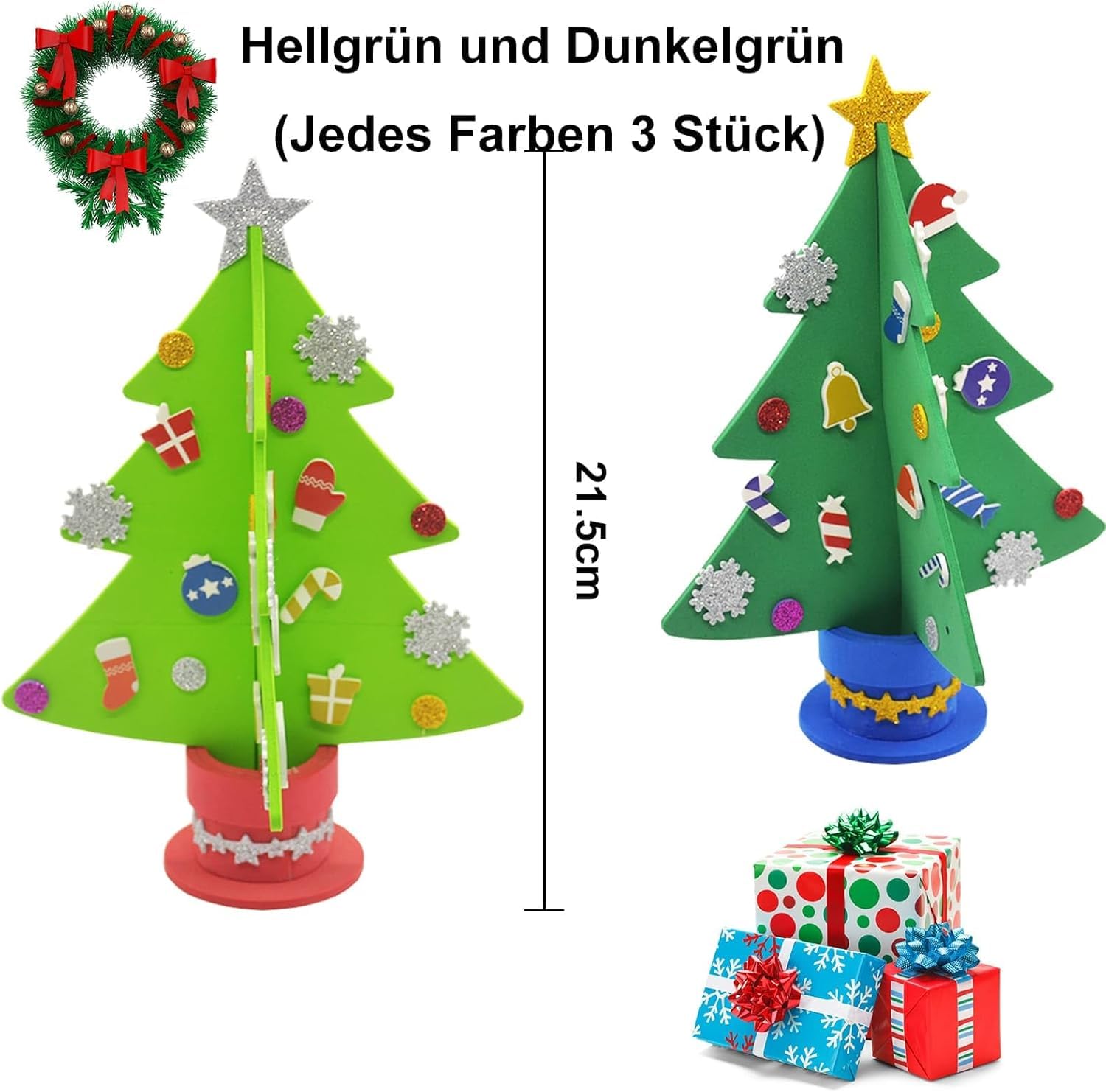 - DIY Weihnachtsbastelset – Enthält 6 Weihnachtsbäume in 2 Farben: 3x Hellgrün und 3x Dunkelgrün. Mit vorgestanzten EVA-Baumteile, Moosgummi-Topf, selbstklebenden Deko-Elementen und Stern sowie einer leicht verständlichen Anleitung.