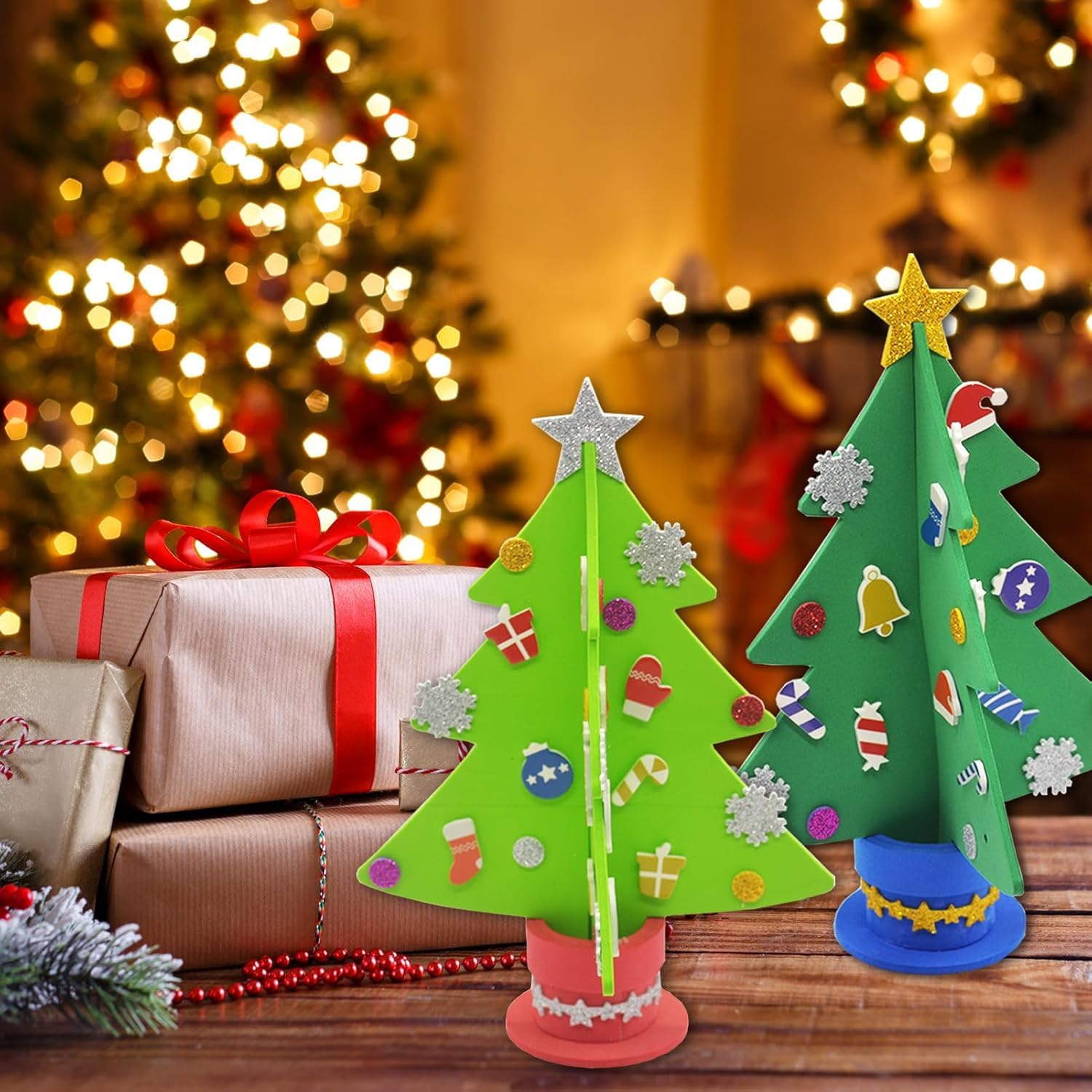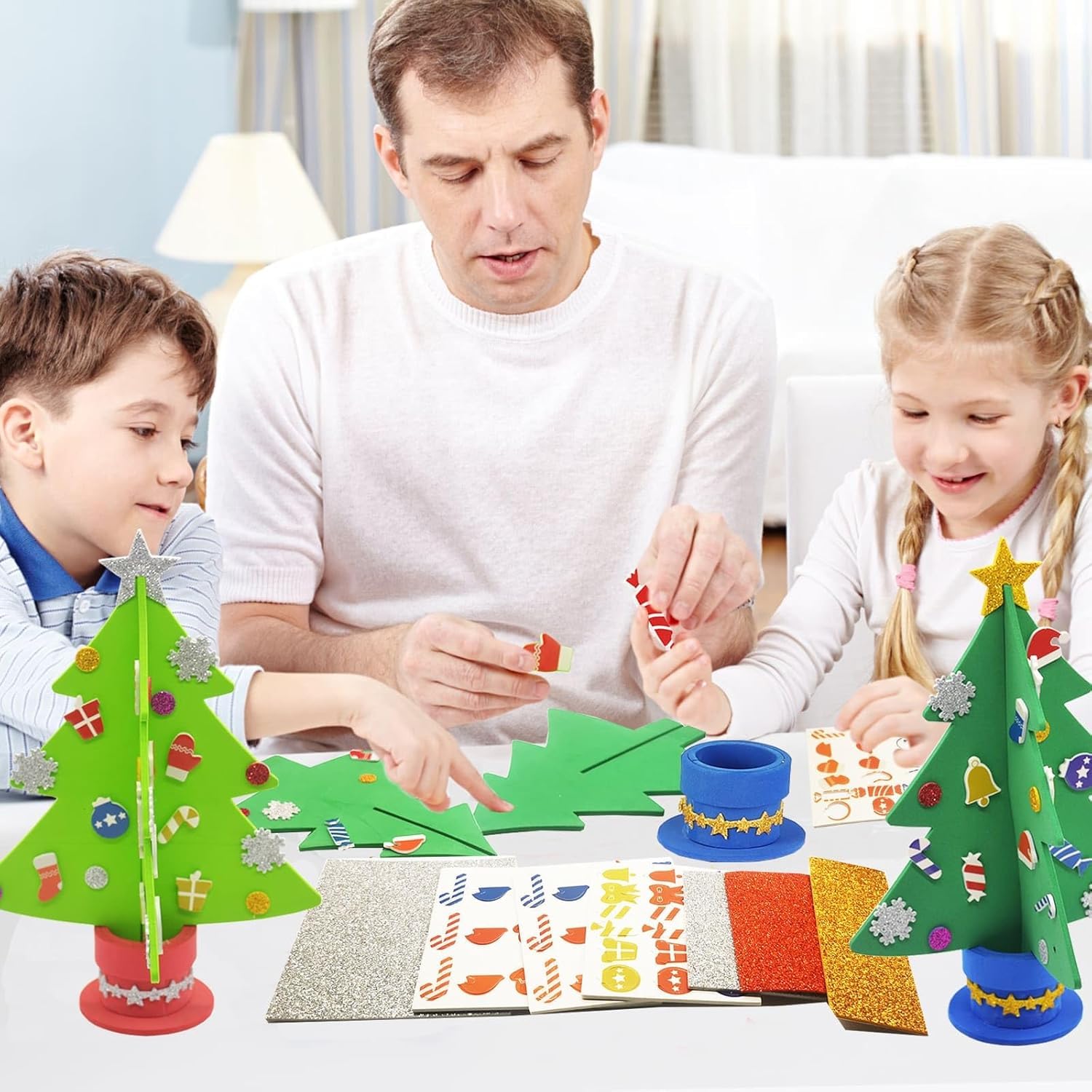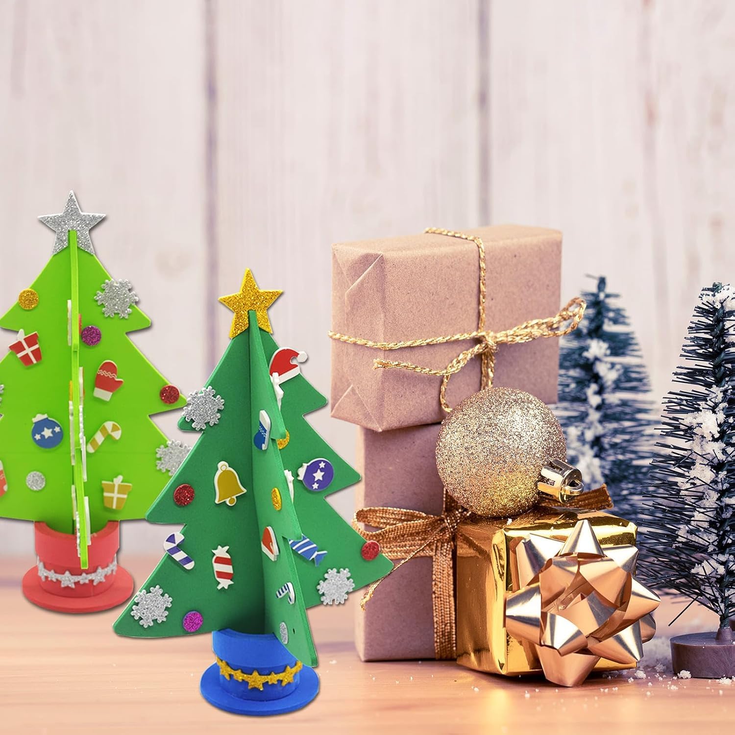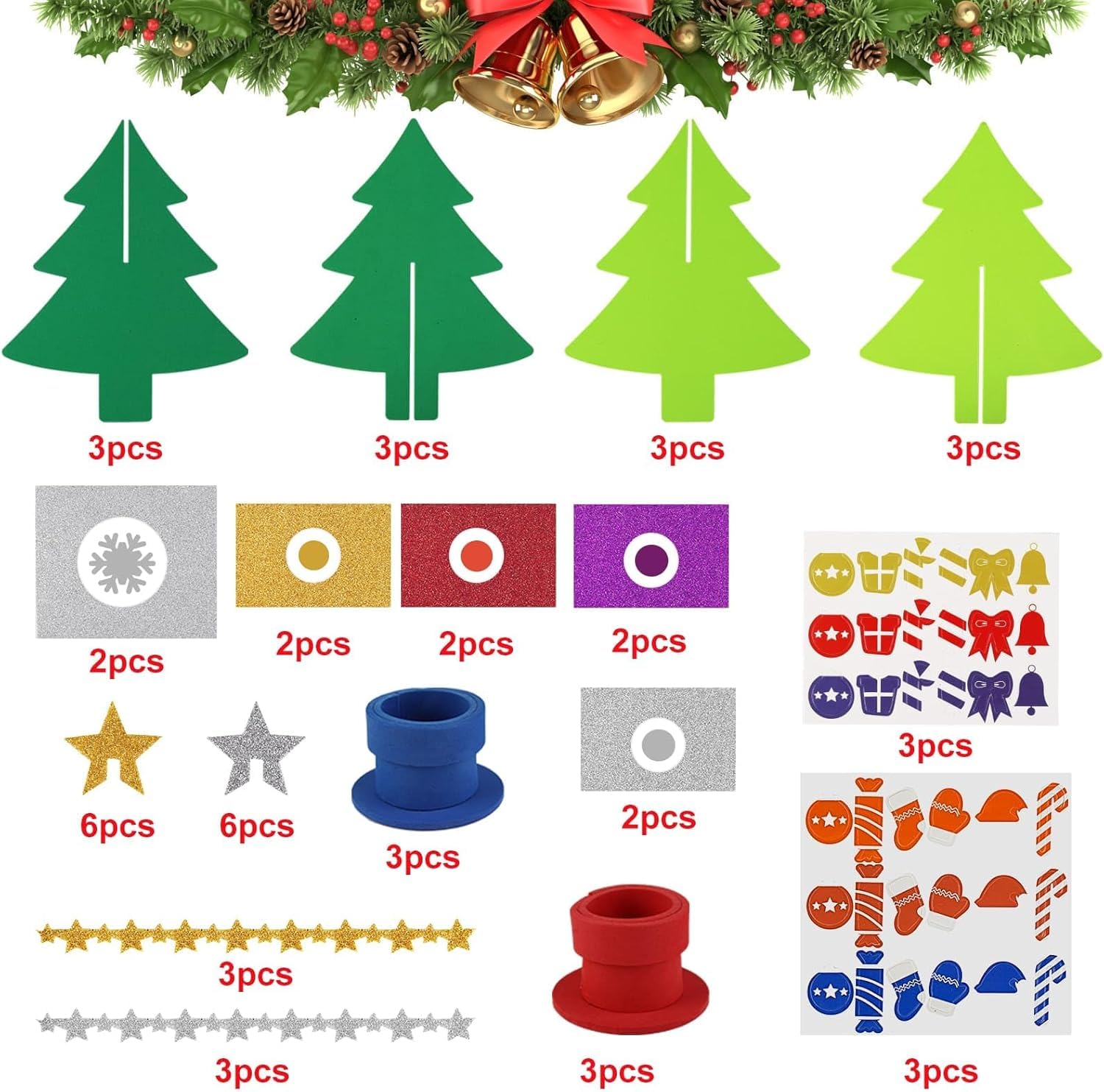 - DIY Weihnachtsbastelset – Enthält 6 Weihnachtsbäume in 2 Farben: 3x Hellgrün und 3x Dunkelgrün. Mit vorgestanzten EVA-Baumteile, Moosgummi-Topf, selbstklebenden Deko-Elementen und Stern sowie einer leicht verständlichen Anleitung.