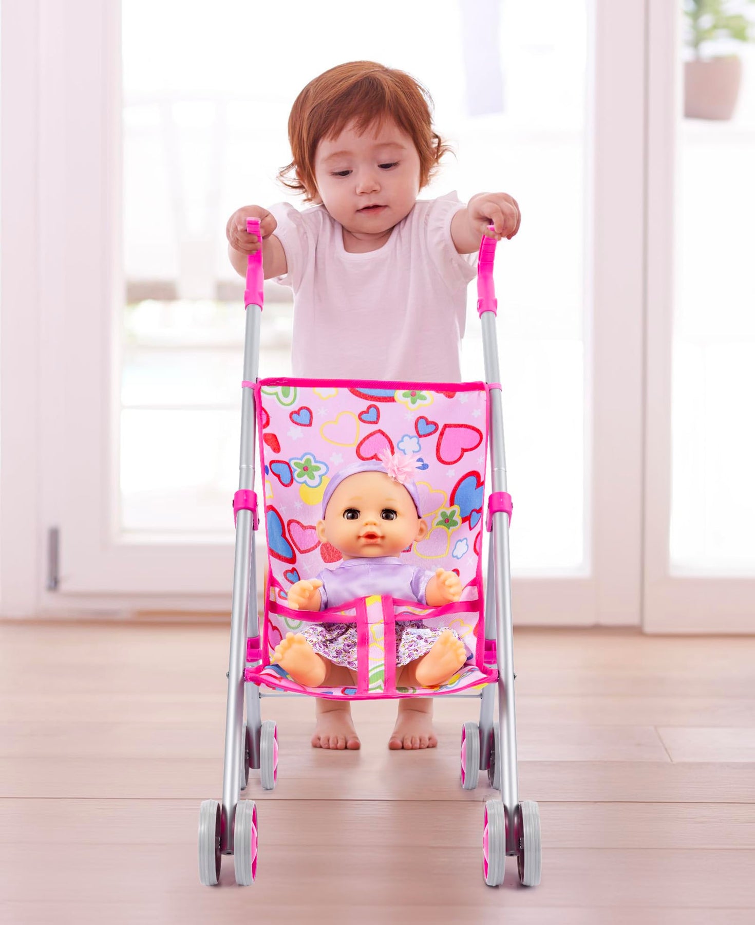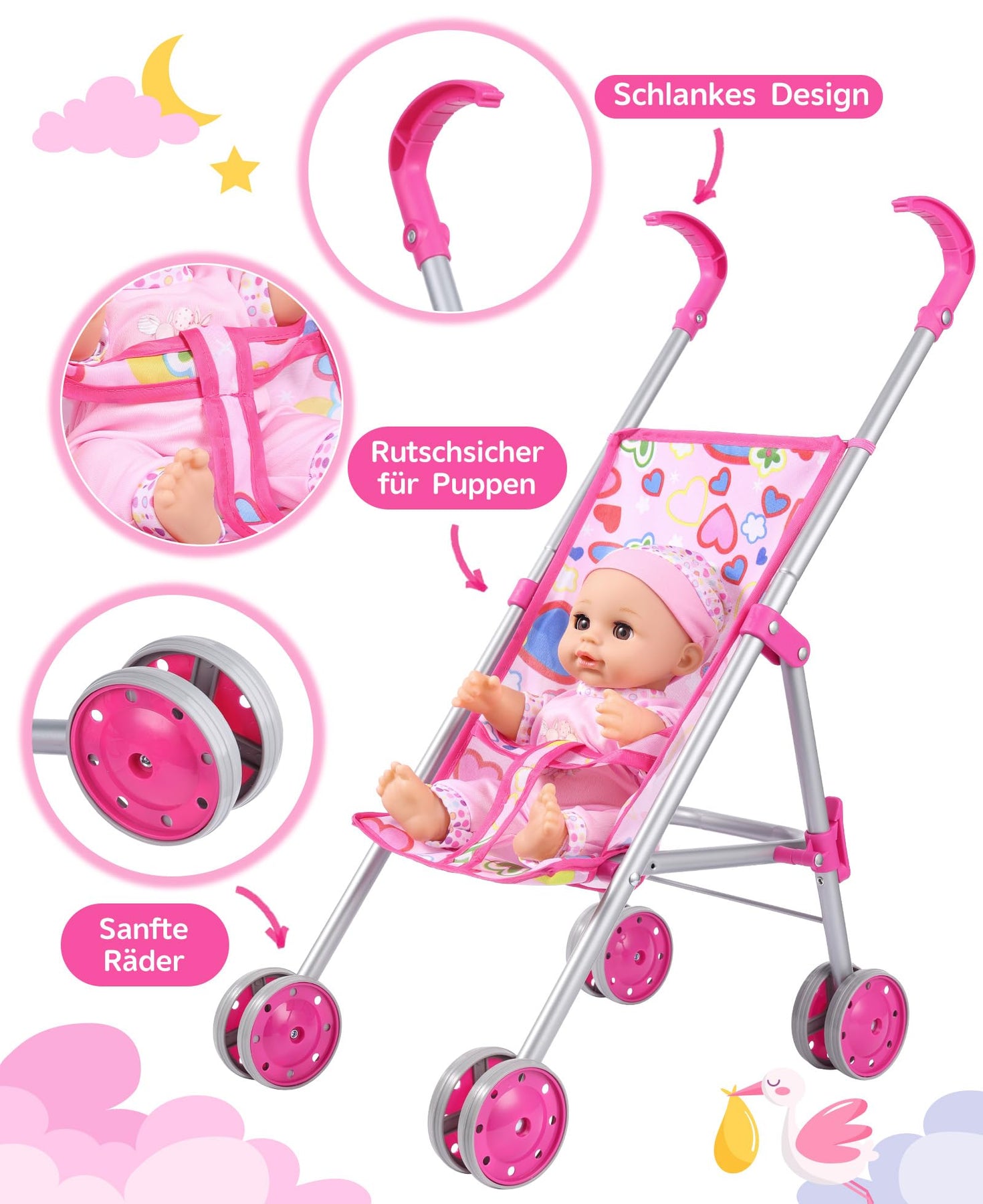 - Holen Sie sich dieses entzückende Puppenwagen-Set nach Hause! Das Spielen mit einem Puppenwagen-Set kann das kooperative Spiel mit Gleichaltrigen fördern und so die sozialen Fähigkeiten und die Kommunikation verbessern, das Herumlaufen mit diesem Puppenwagen kann die körperliche Aktivität und das Spielen im Freien fördern, Kinder können das Verhalten von Erwachsenen nachahmen, was ihnen hilft, Aktivitäten und Verantwortlichkeiten im echten Leben zu verstehen.