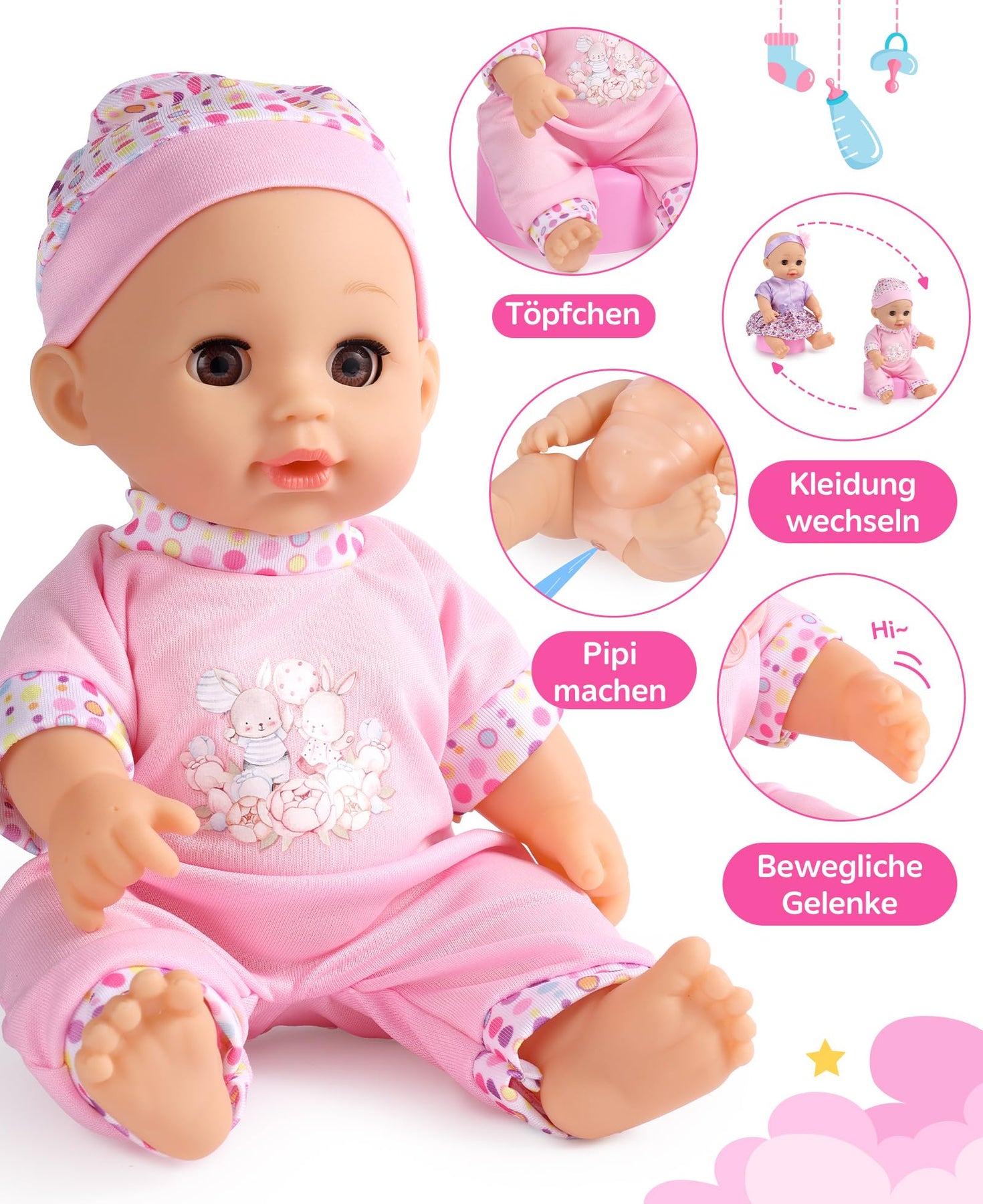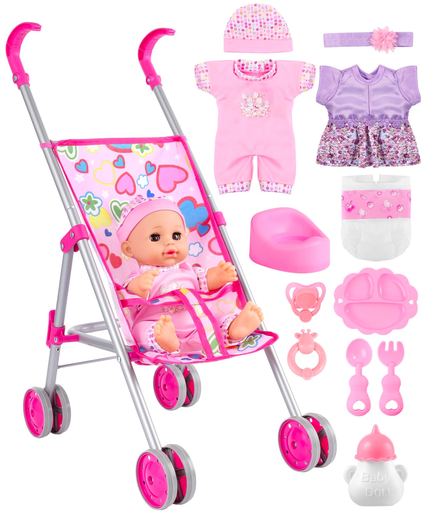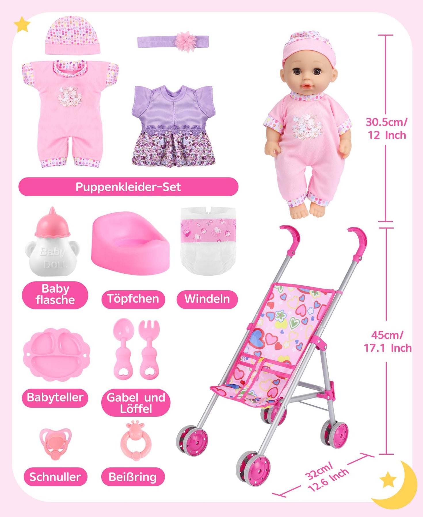 - Enthaltene Komponenten: 1 x Babypuppenwagen (für Puppen bis 40 cm), 1 x 30 cm Babypuppe, 2 x Outfits, 1 x Flasche, 1 x Windel, 1 x Puppentöpfchen, 1 x Schnuller, 1 x Beißspielzeug, 1 x Teller, 1 x Besteck. Ermöglicht verschiedene Spielarten.