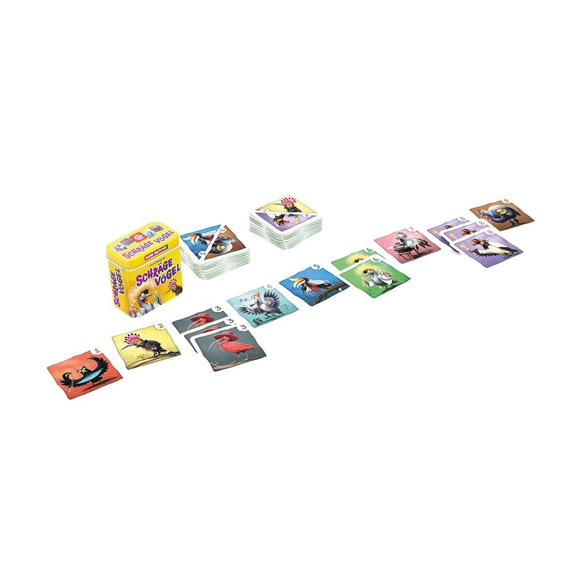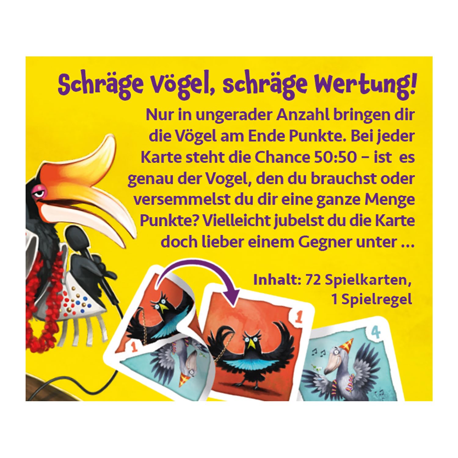 Schräge Vögel, schräge Wertung! Nur in ungerader Anzahl bringen dir die Vögel am Ende Punkte. Bei jeder Karte steht die Chance 50:50 - ist es genau der Vogel, den du brauchst oder versemmelst du dir eine ganze Menge Punkte? Vielleicht jubelst du die Karte doch lieber einem Gegner unter... Inhalt: 72 Spielkarten, 1 Spielregel