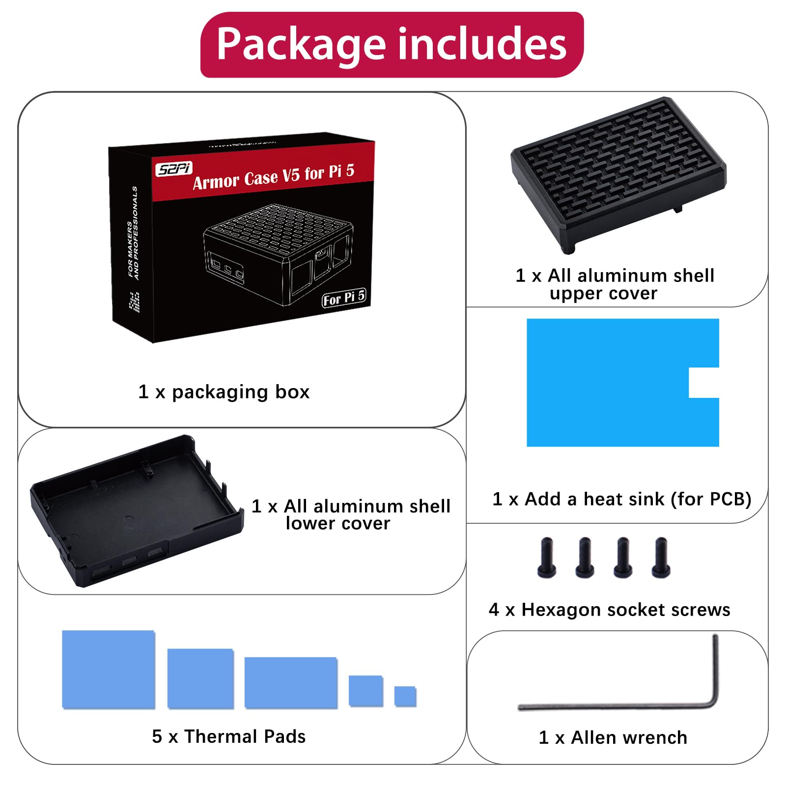 - 【Packing List】1 x Raspberry Pi 5 Aluminum Case;5 x Thermal Pads;1 x Screws Pack;1x Allen Wrench