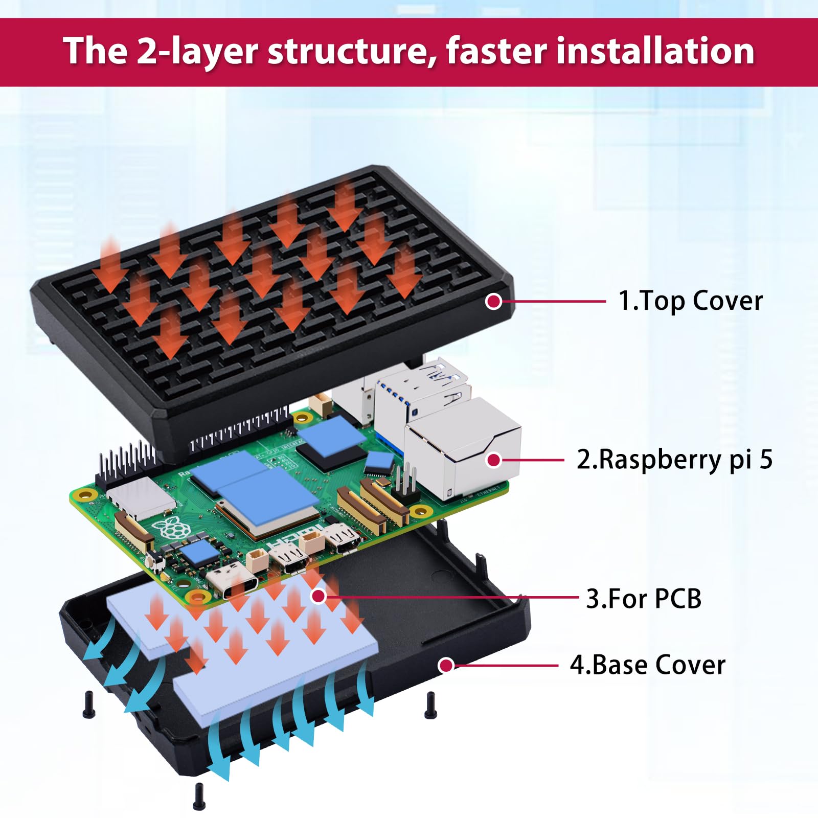 - 【Passive Cooling Design】Don't need extra fan, the case itself acts as a heat sink and built-in Five Heatsink Pillars for better heat dissipation and comes with thermal pads for passive cooling. Can cool your Raspberry Pi no fan and no noise.