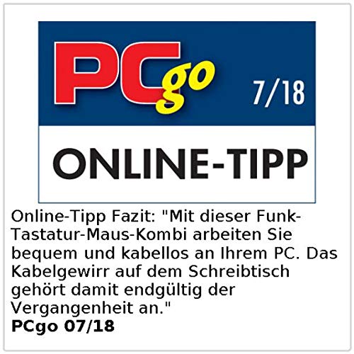 PCgo (07/18): Online-Tipp Fazit: "Mit dieser Funk-Tastatur-Maus-Kombi arbeiten Sie bequem und kabellos an Ihrem PC. Das Kabelgewirr auf dem Schreibtisch gehört damit endgültig der Vergangenheit an." .