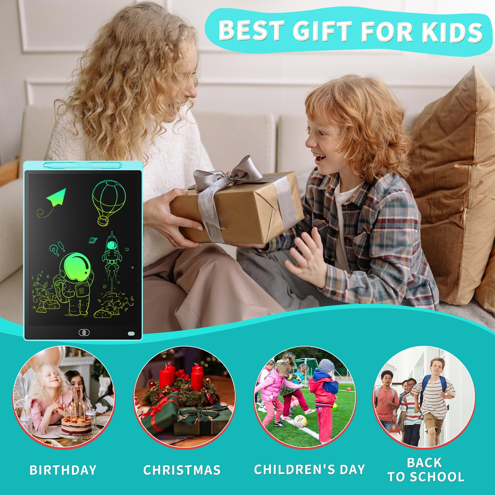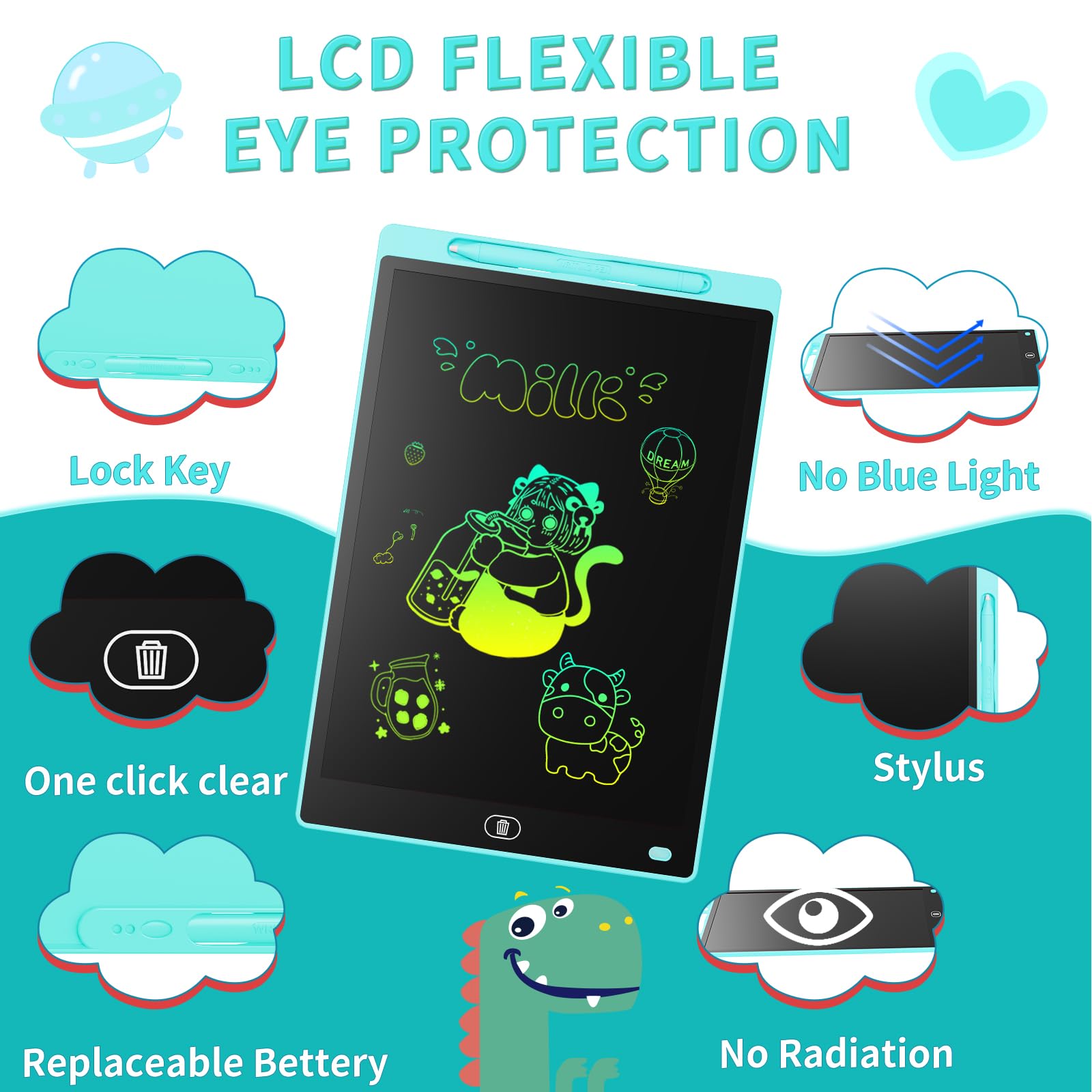 - Klarer Ein-Knopf-Bildschirm und Sperrfunktion: Die Ein-Knopf-Löschfunktion macht das Zeichenbrett zu einem endlosen Blatt Papier, das immer wieder gekritzelt werden kann, und Kinder können es jederzeit problemlos neu starten. Darüber hinaus verfügt das Zeichenbrett über eine Ein-Tasten-Sperrfunktion, um zu verhindern, dass Kinder versehentlich ein geliebtes Gemälde löschen und verlieren.