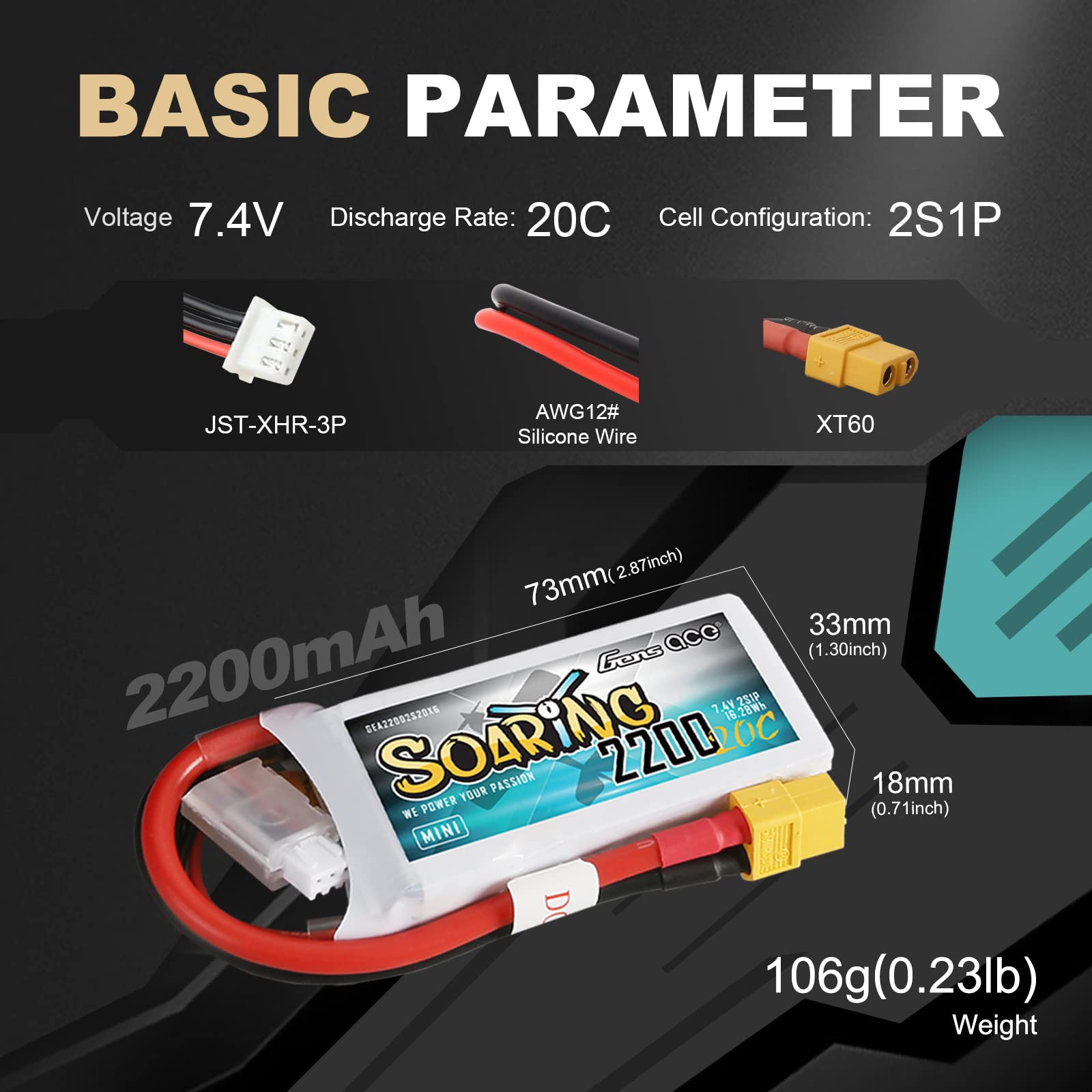 • Parameter——Gens ace 2200mAh 7.4V Akku, Batteriespannung: 7,4 V, Konfiguration: 2S, Kapazität: 2200 mAh, Anschluss: XT60-Stecker