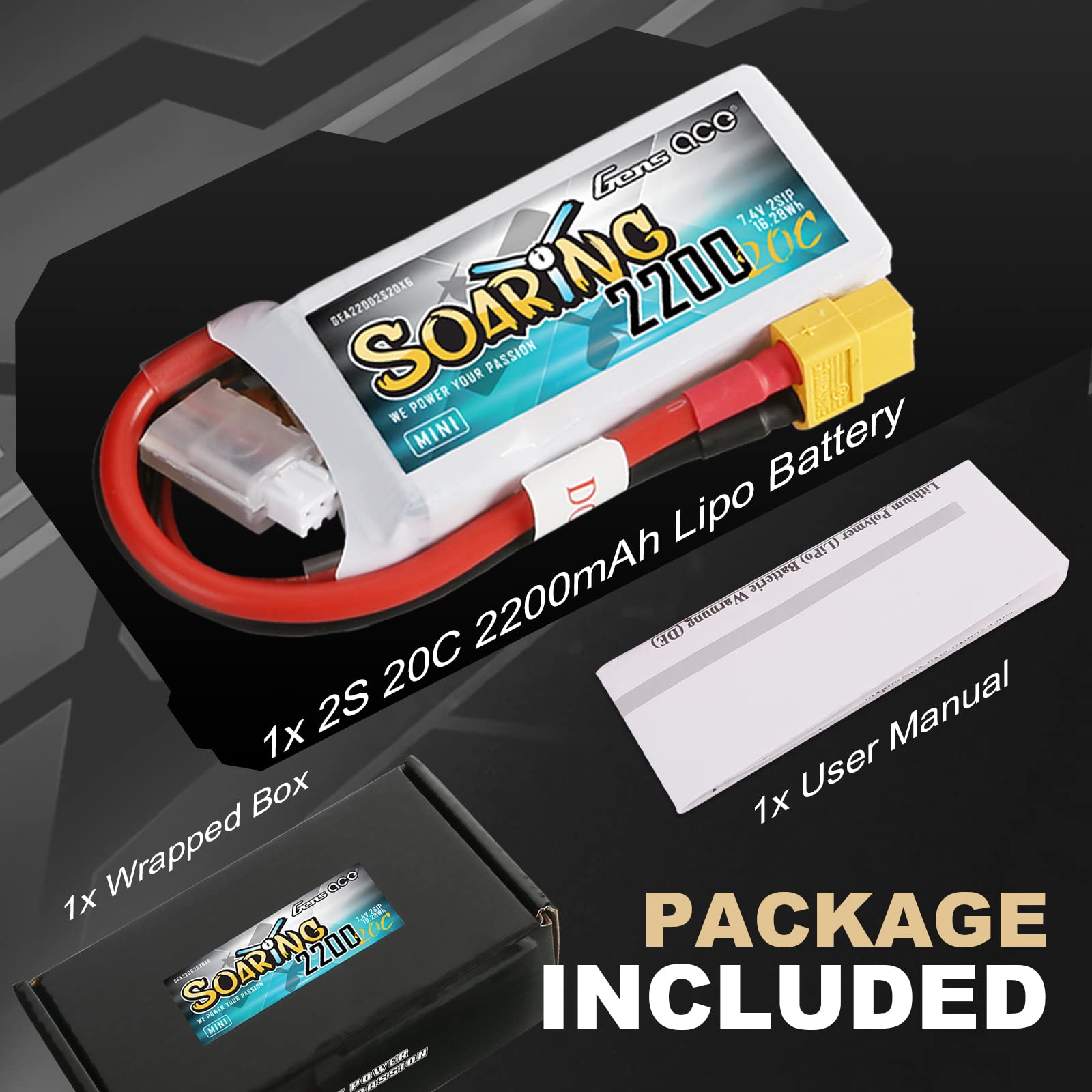• Spezifikation——Gens ace 2S 7,4 V 2200mAh Lipo-Akku hat eine sehr leichte und kompakte Größe. Länge: 73 mm , Breite: 33 mm , Höhe: 18 mm , Nettogewicht: 106 g