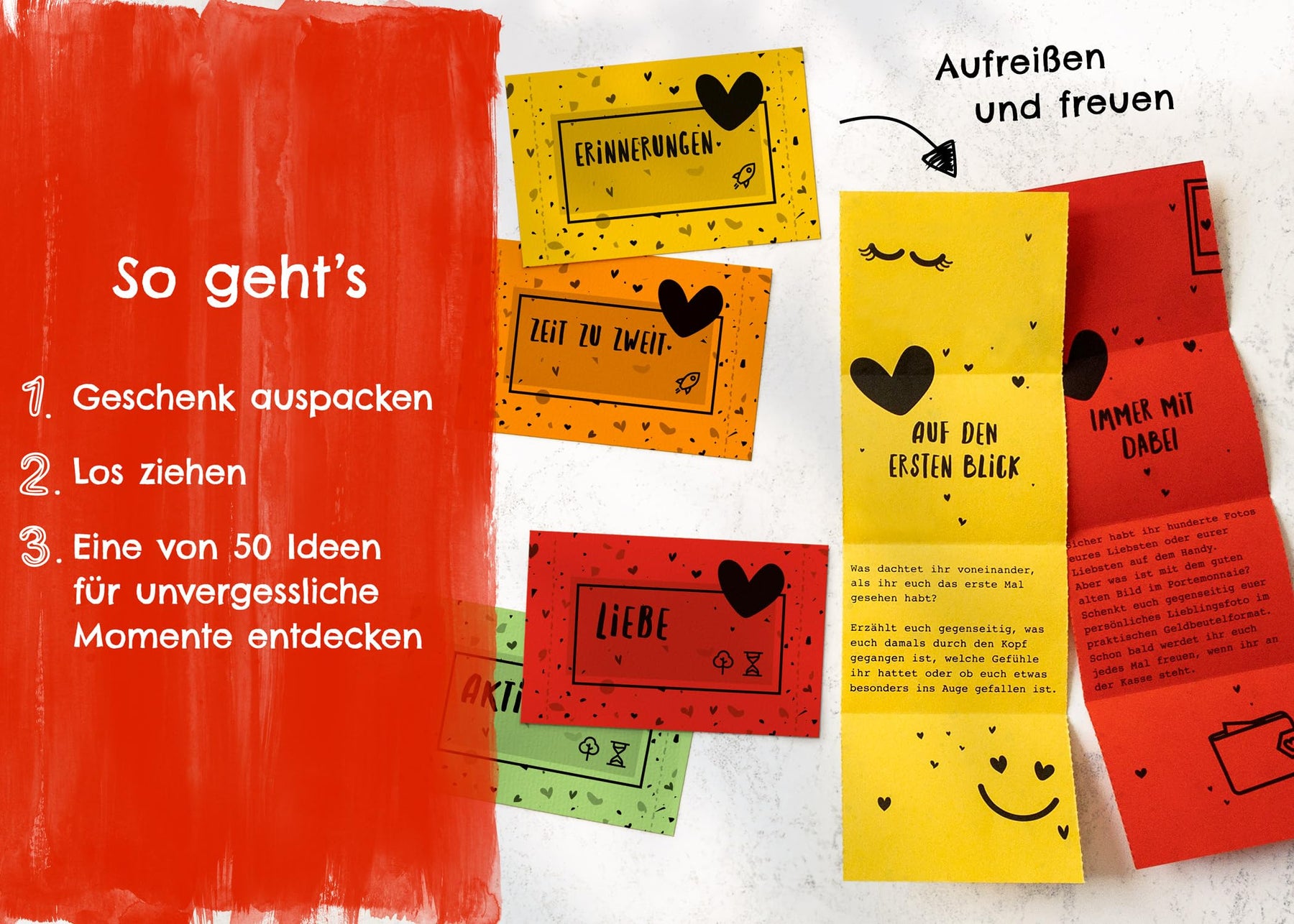 • SPIEL, SPAß, LIEBE | Los auswählen, aufreißen und einen unvergesslichen Moment zu zweit erleben. Das Beste: In der Losbox gibt’s keine Nieten, jedes Los ist ein Gewinn für mehr Zweisamkeit!