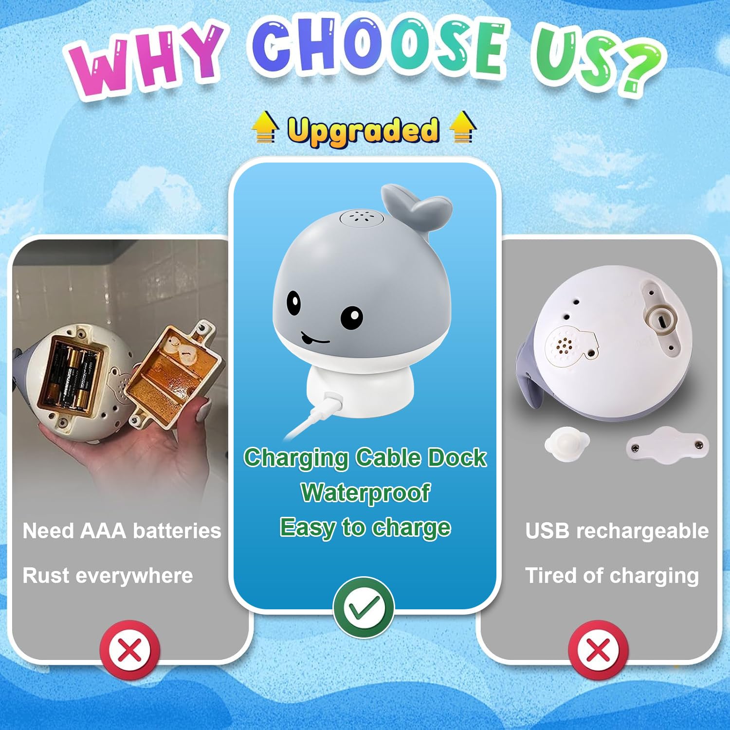- 🐳【Aufladbares Whale Badespielzeug】Jede volle Leistung kann mehr als 2 Stunden Badespielzeit unterstützen. Sparen Sie zusätzliche Batteriekosten und schützen Sie die Umwelt, Sie brauchen keine neuen Batterien mehr zu verschwenden.