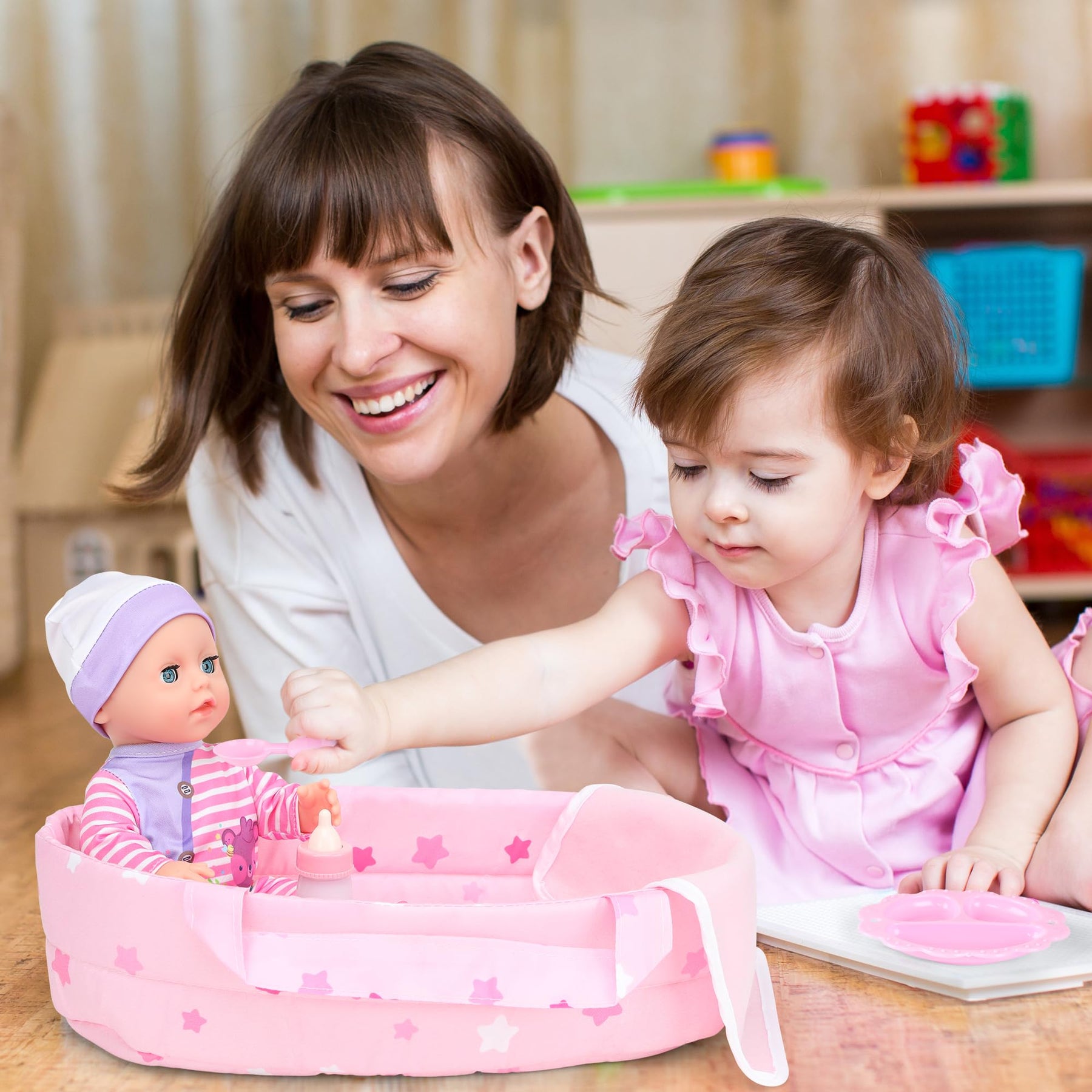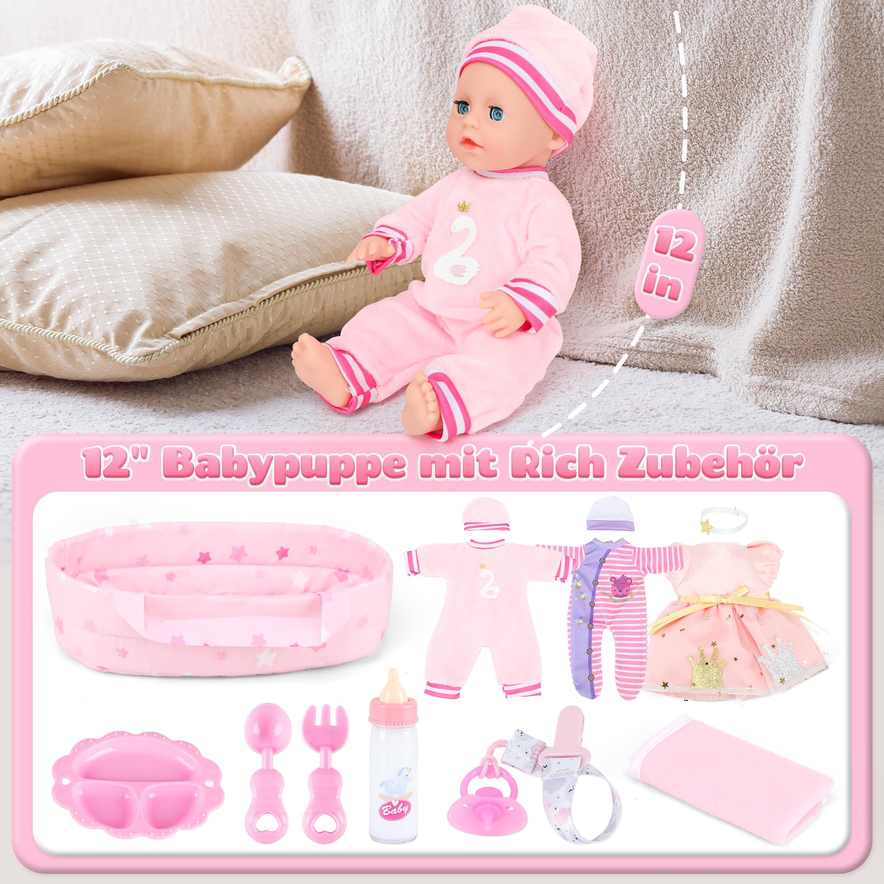GirlDiary Realistische Mompe 12 Zoll mit Zubehör Set, 3 Kleider, Stubenwagen Bett, Fütterung Playset, Baby Puppen Mädchen für 3-8 Jahre, Baby Puppe Spielzeug mit Kleidung 00310