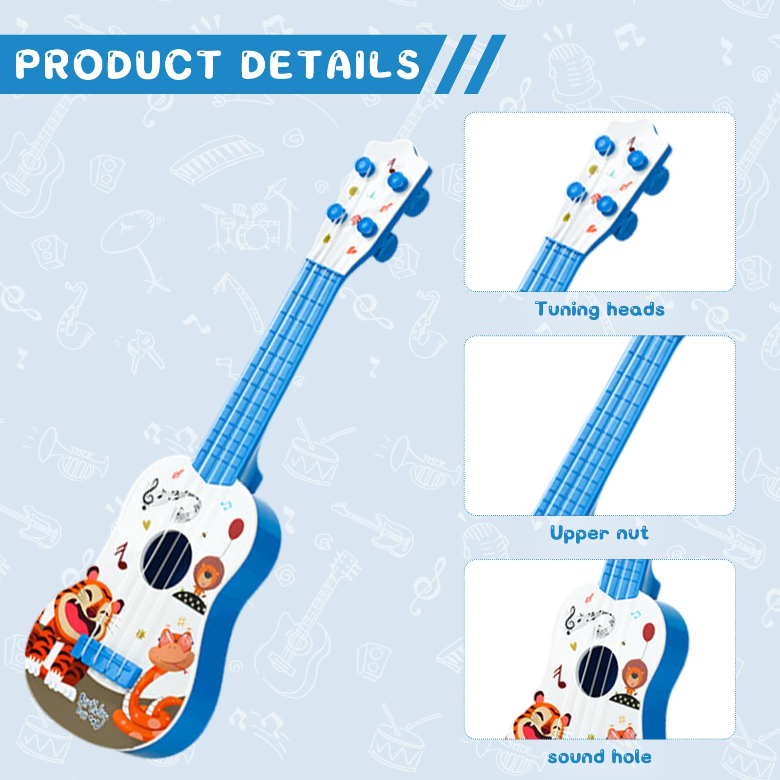 - đăNiedliches Designă 3 verschiedene Tiermuster, sehr niedlich und realistisch. Flexible verstellbare Saiten ermöglichen es Ihrem Kind, schöne Musik in verschiedenen Musiknoten, Melodien und Akkorden zu spielen.