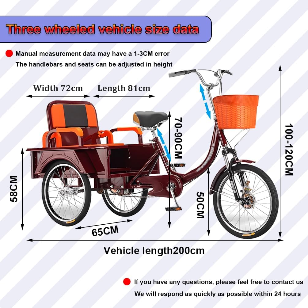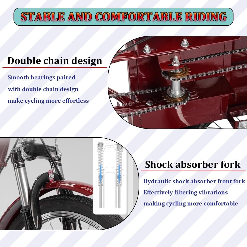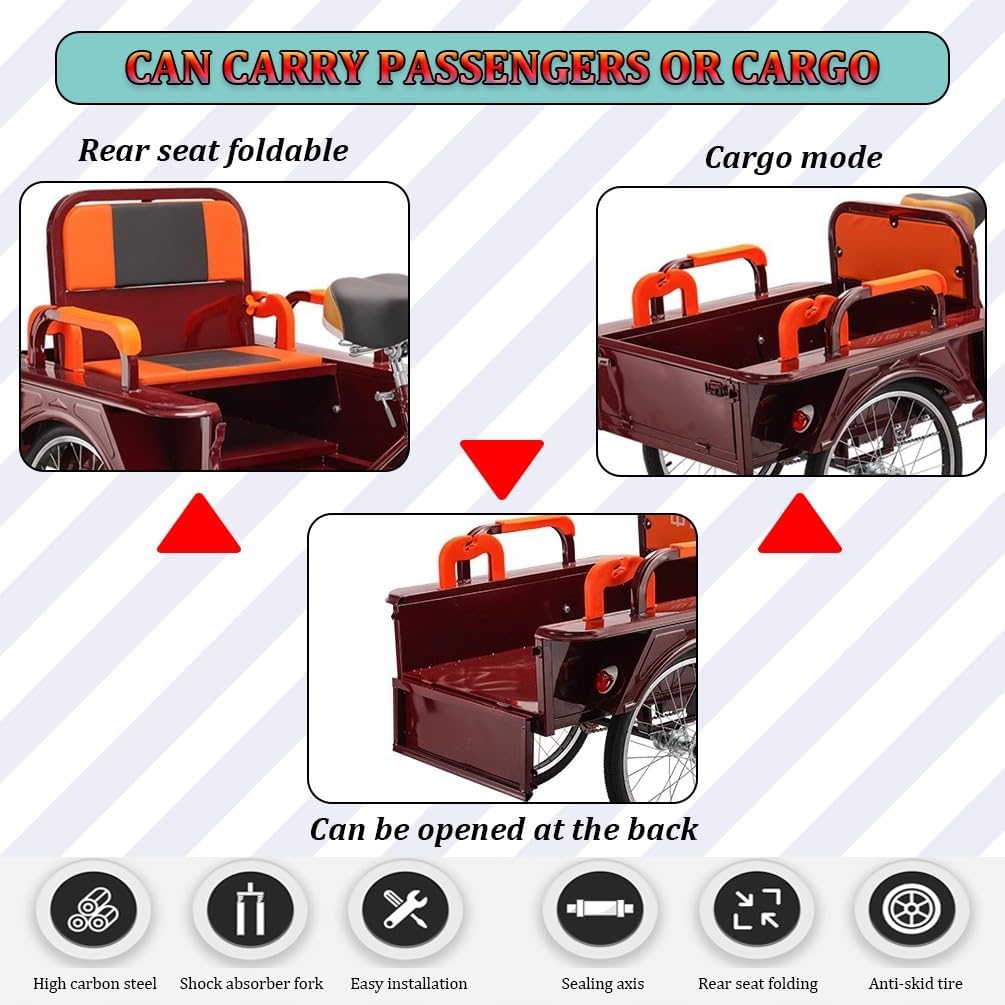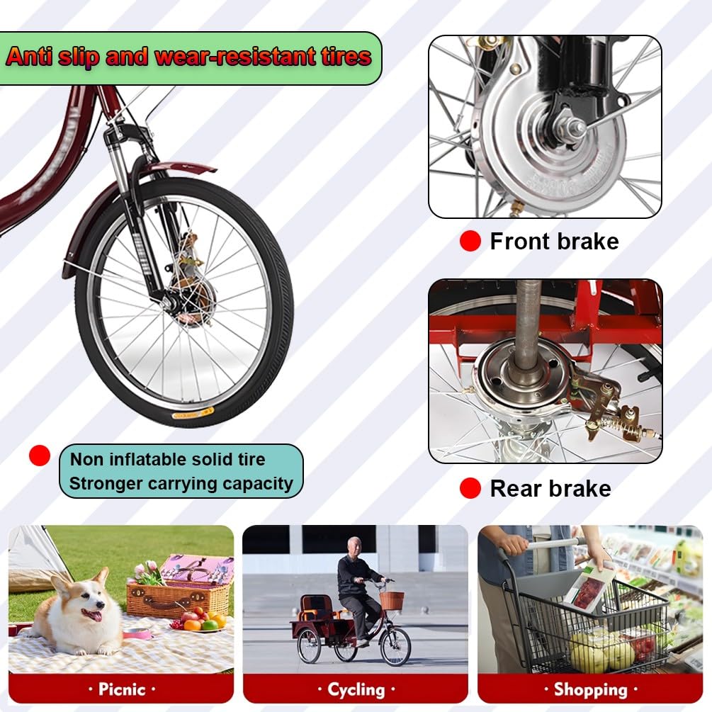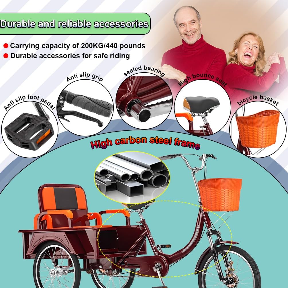 • ✅ DREIRAD FÜR ERWACHSENE: Unser Dreirad für Erwachsene ist mit einem Sicherheitsgurt auf dem Rücksitz ausgestattet, Kinder können auf dem Rücksitz sitzen, bequem für Mama, um die Kinder von der Schule abzuholen und Senioren, um einkaufen zu gehen.Das Dreirad für Erwachsene mit vorderem Korb und aufklappbarem hinteren Korb ist perfekt für den Transport von Lebensmitteln, persönlichen Gegenständen, Picknickzubehör, Haustieren und anderen Dingen. Die robuste Stahlkonstruktion trägt bis zu 440 lbs.