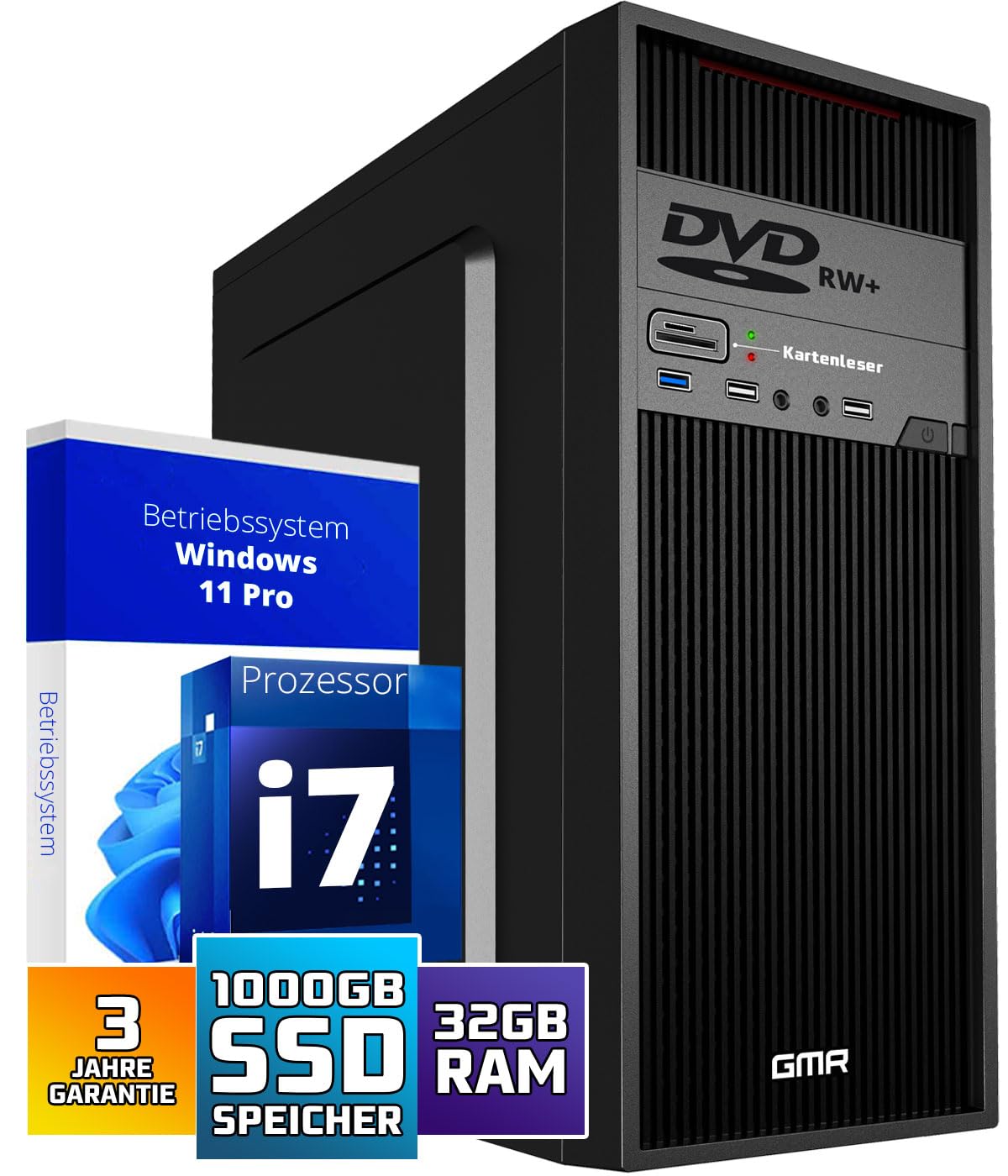 GMR Ultra Max Desktop PC - Intel i7, Windows 11 Pro, 32GB RAM, 1000GB SSD, USB 3, WiFi, Bluetooth, Office PC Mit DVD, Cardreader, 3 Jahre Garantie - Desktop PC Windows 11 - Sofort Einsatzbereit
