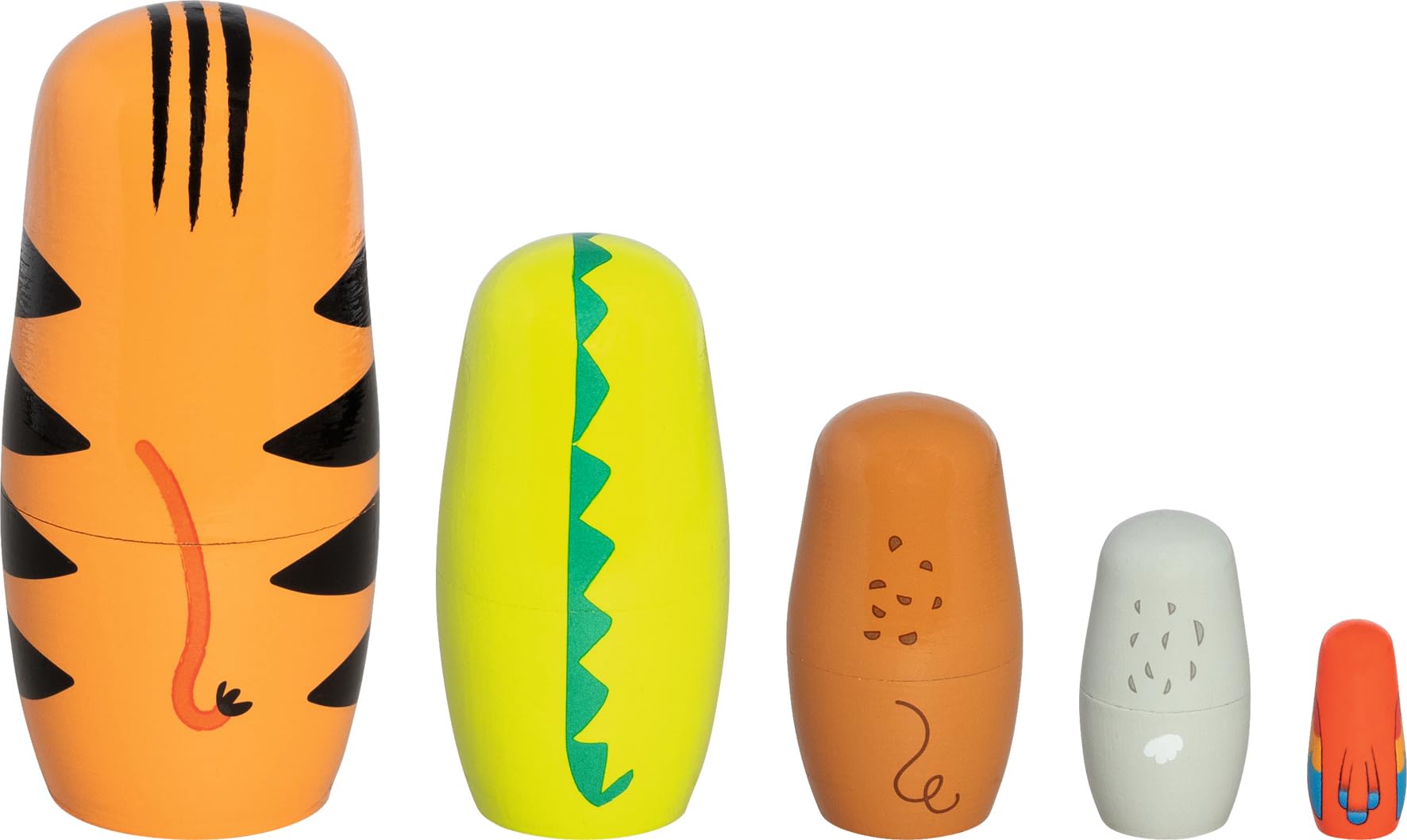 - Klassisches Stapelspiel: Die goki Matroschka aus Holz umfasst 5 liebevoll gestaltete Tierfiguren wie Tiger, Krokodil, Affe, Koala, Papagai, die sich ineinander stapeln lassen