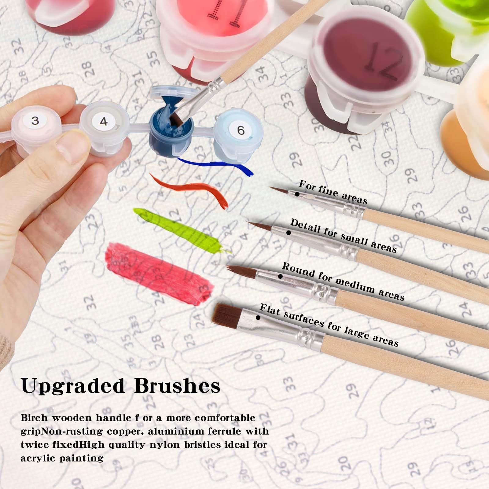- Hochwertige Materialien: Unsere malen nach zahlen leinwand ist dick und haltbar, die Zahlen auf der Leinwand sind klar und gut lesbar, wird aufgerollt verpackt, knittert nicht und muss nicht gebügelt werden; Verschiedene Größen von professionellen Pinseln, auch extrem kleine Flächen können leicht gemalt werden; Hochwertige Acrylfarben, die Farben sind hell und verblassen nicht, ein oder zwei Schichten können leicht Zahlen und Linien abdecken, wasserdicht nach dem Trocknen, kann für eine lange