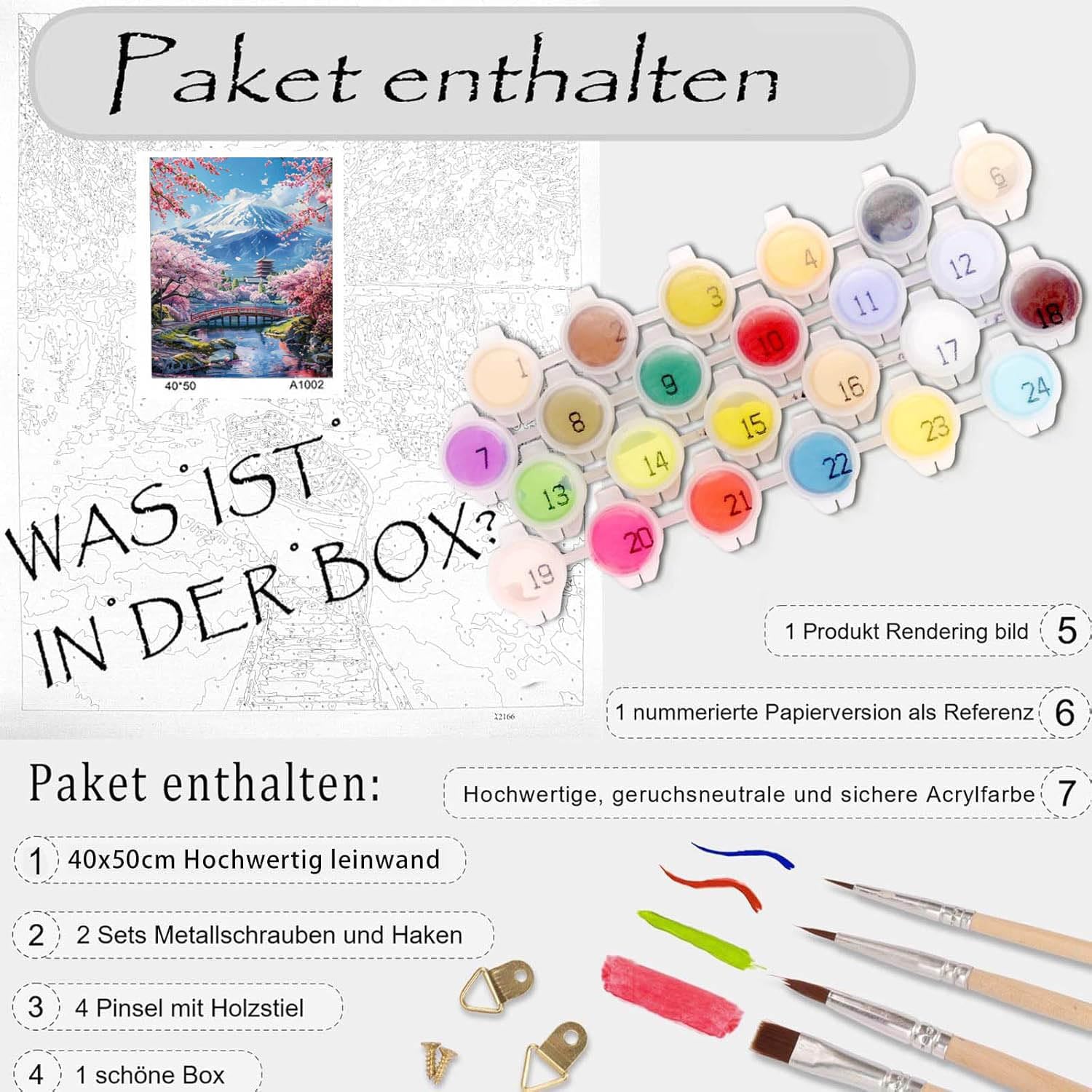 - Malen Nach Zahlen für erwachsene Landschaft: 1 Stück Malen Nach Zahlen erwachsene Leinwand(ohne Rahmen), 1 Set Acrylfarbe, 4 hochwertige Pinsel, 1 Wandbehang-Set, 1 farbige Postkartenführung, 1 Papierkopie nummerierter Leinwand als Referenz, 1 schön geschenk Box