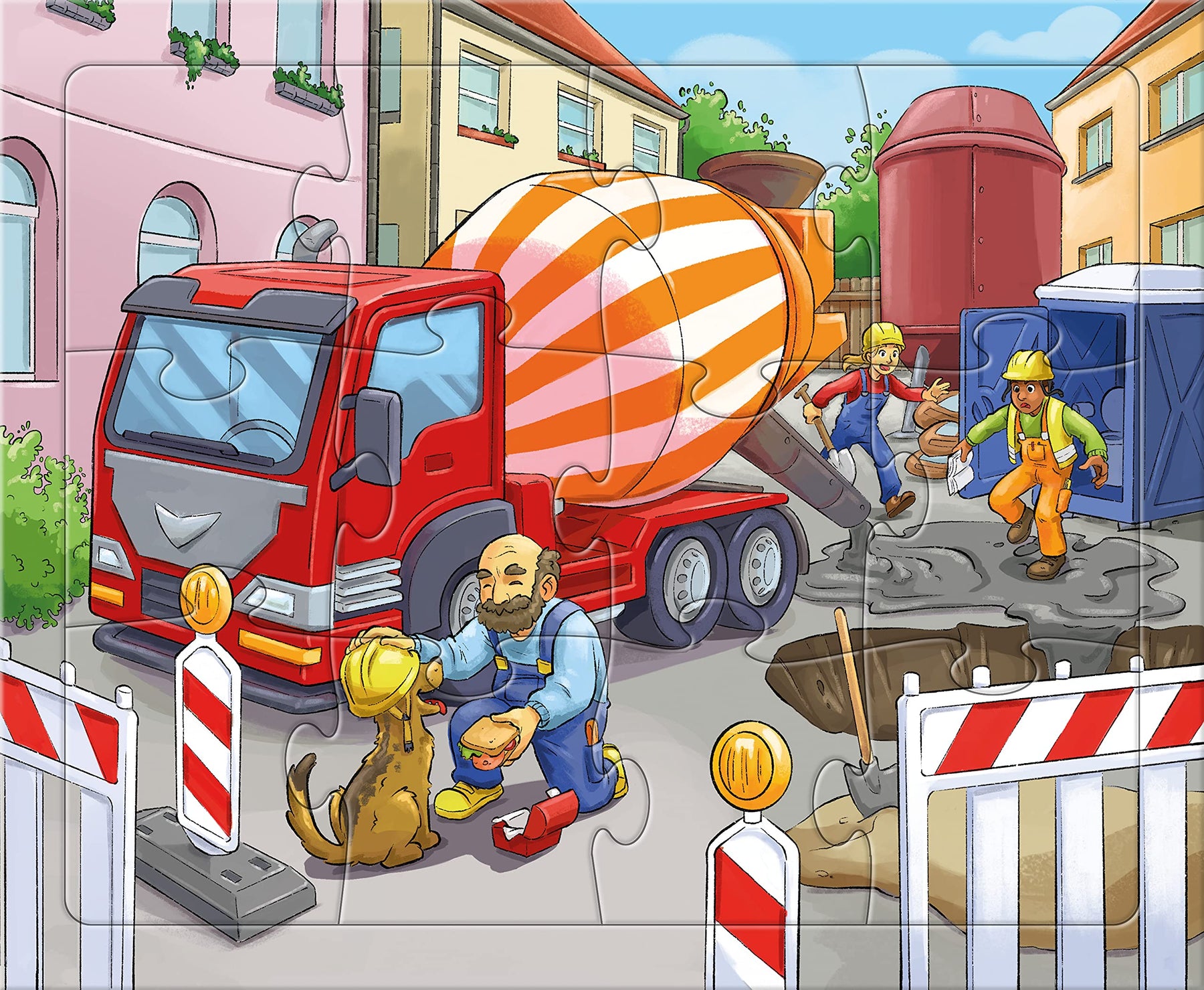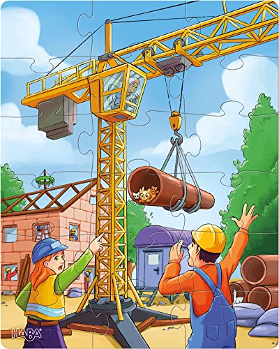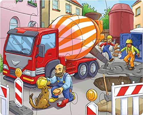 Spannende Szenen spielen sich auf den Baustellen ab: Der Kran hebt gerade ein Rohr an, in dem sich eine Katzenfamilie versteckt hat. Der Bagger gräbt ein uraltes Dino-Skelett aus. Der Betonmischer verschüttet seine ganze Ladung auf der Straße, während sich ein Bauarbeiter mit einem Hund anfreundet. Stück für Stück entdecken Kinder ab 3 Jahren die Baustellen-Puzzles mit vielen Details. Das animiert zum Erzählen und erweitert den Wortschatz. Ganz nebenbei trainieren kleine Puzzle-Meister Konzentration und Feinmotorik. Die Kinder-Puzzles bestehen aus stabiler Pappe und sorgen lange für riesen Puzzle-Spaß.