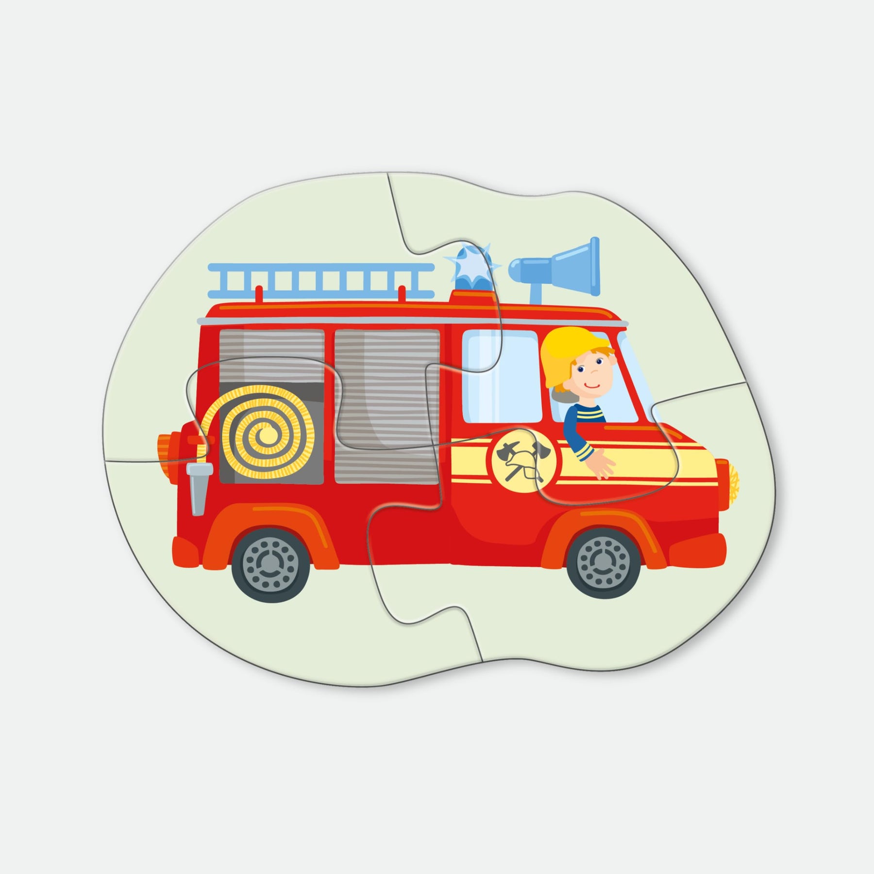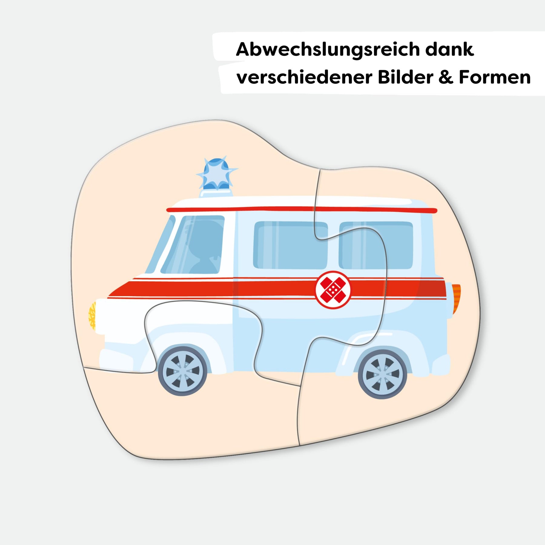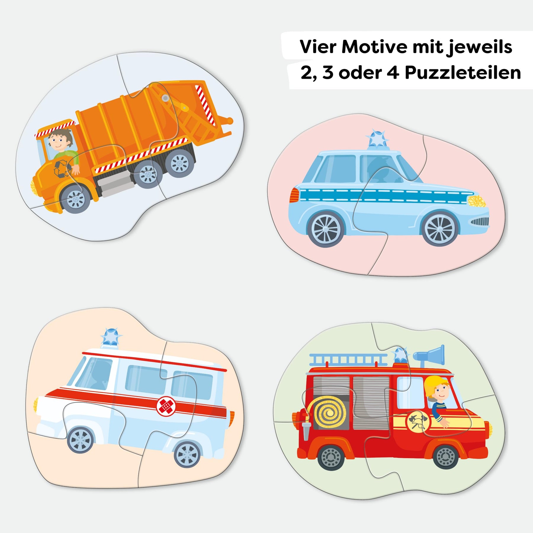 Achtung, hier kommt riesen Puzzlespaß für die Kleinsten! Mit der Puzzlesammlung „4 erste Puzzles – Einsatzfahrzeuge“ von HABA setzen Kleinkinder eindrucksvolle Autos in verschiedenen Farben zusammen: das blaue Polizeiauto, den weißen Krankenwagen, das orange Müllauto und das rote Feuerwehrauto. Die vier Motive bestehen aus 2, 3 und 4 griffigen Teilen aus stabiler Pappe. Beim genauen Schauen gibt es viele Einzelheiten zu entdecken und spannende Geschichten zu erzählen. So fördert das Babypuzzle die sprachliche Entwicklung, das Benennen von Farben und übt spielerisch die Feinmotorik der Kleinen.