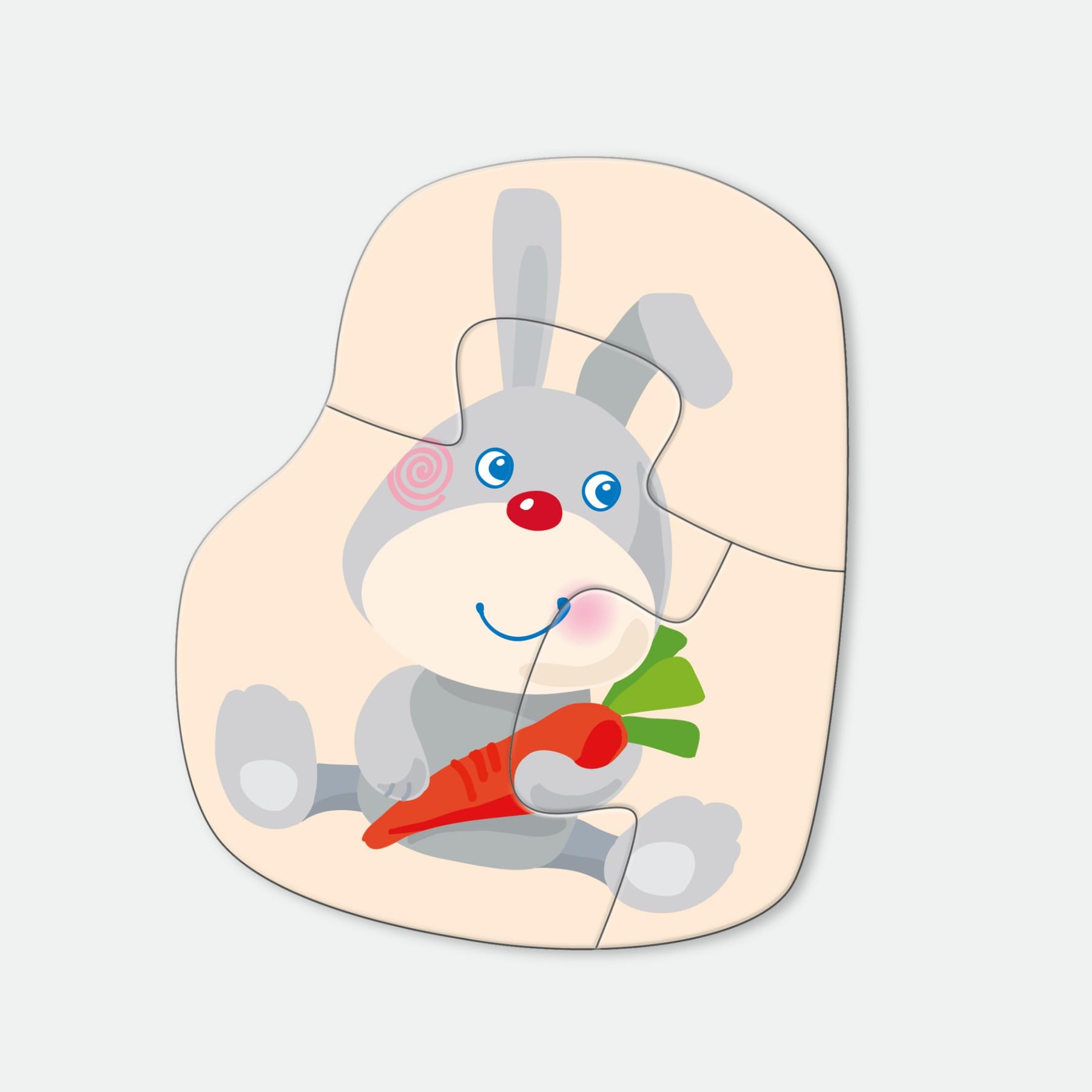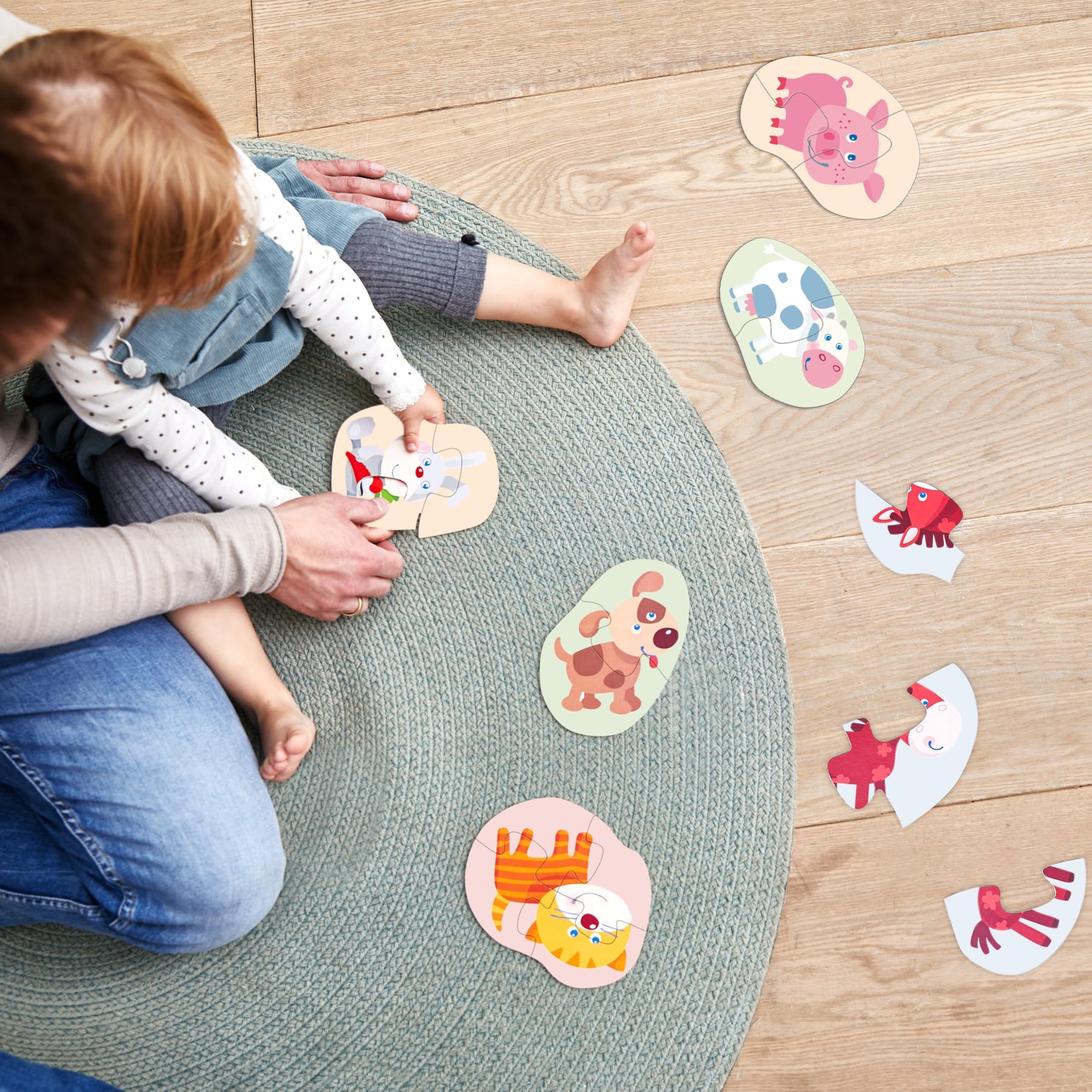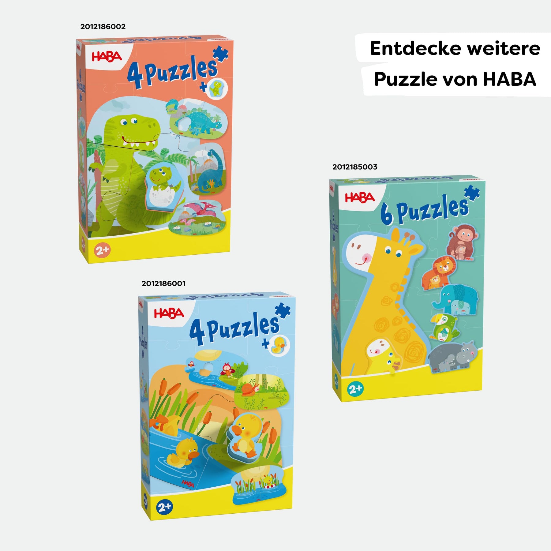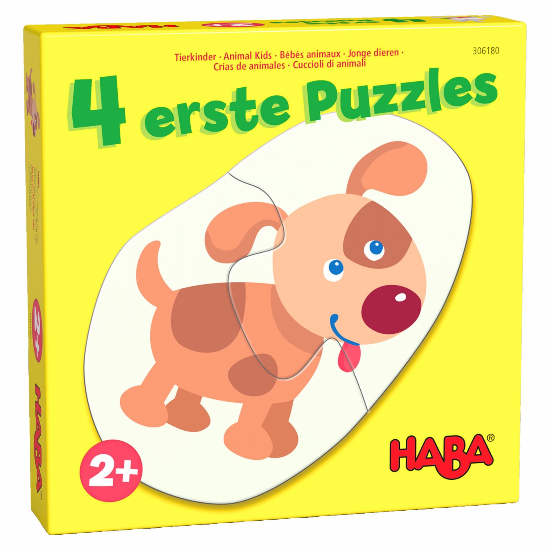 Vier niedliche Tiere sorgen für großen Puzzlespaß. In der Puzzlesammlung „4 erste Puzzles – Tierkinder“ von HABA treffen Kleinkinder ab 2 Jahren tierische Freunde: die süße Katze, den verspielten Welpen, das drollige Kaninchen und das neugierige Fohlen. Puzzleanfänger können die 4 Motive aus 2 bis 4 großen, griffigen Teilen aus stabiler Pappe zusammensetzen. Das Babypuzzle fördert die Feinmotorik altersgerecht, lädt zum genauen Schauen ein und übt die Hand-Auge-Koordination. Die lustigen Tierkinder regen zum Erzählen fantasievoller Geschichten an und unterstützen so die Sprachentwicklung.