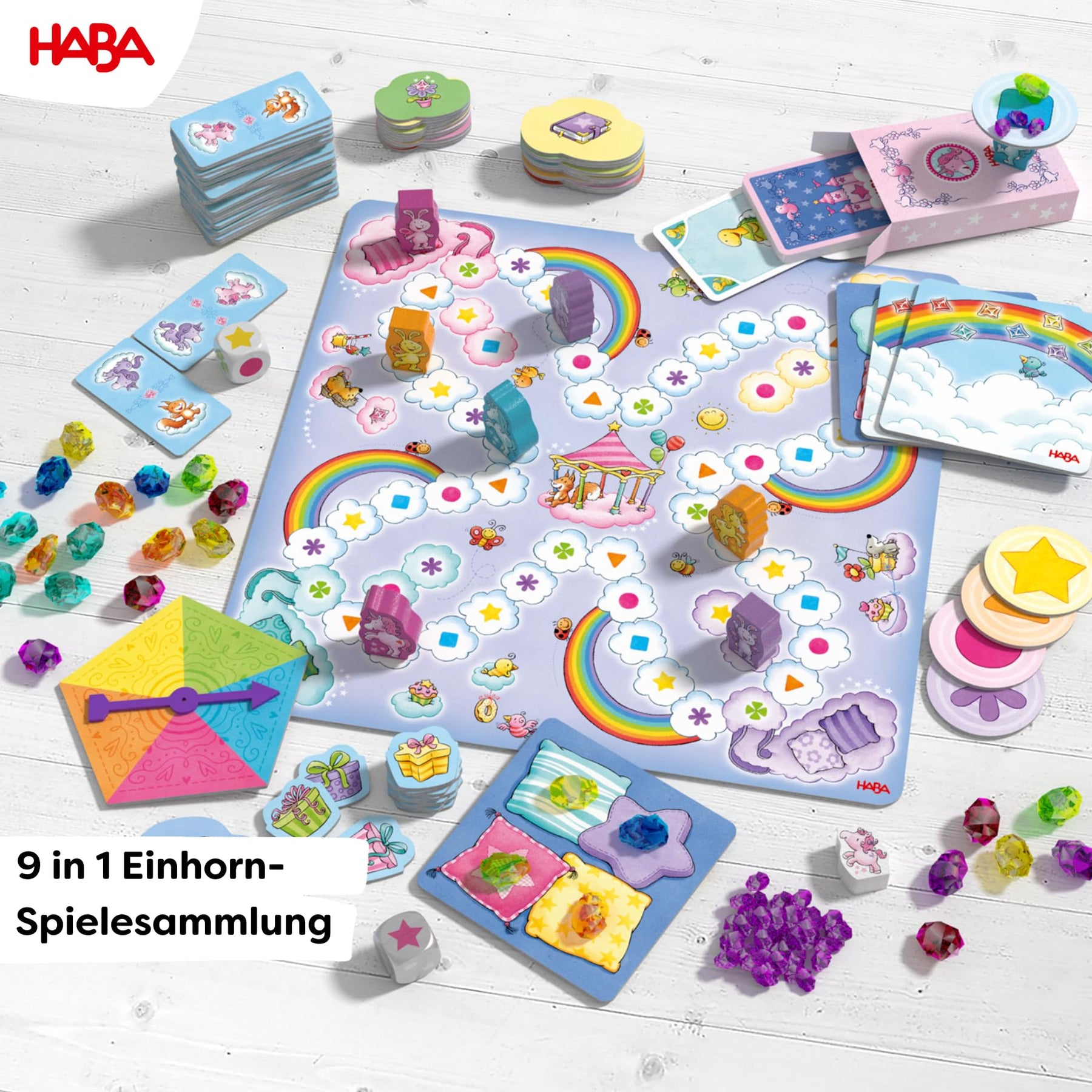 Die große Spielesammlung enthält 9 abwechslungsreiche Spielideen rund um das beliebte Einhorn und ihre Freunde. Würfel-Wettlauf, Glitzer-Domino, Einhorn-Mau-Mau, Kristalle-Balancieren und noch mehr. Langeweile? Fehlanzeige! Ein zauberhaftes Spielvergnügen für kleine und große Einhorn-Fans. Mit einfachen Regeln, zauberhaften Illustrationen und hochwertigem Spielmaterial.
