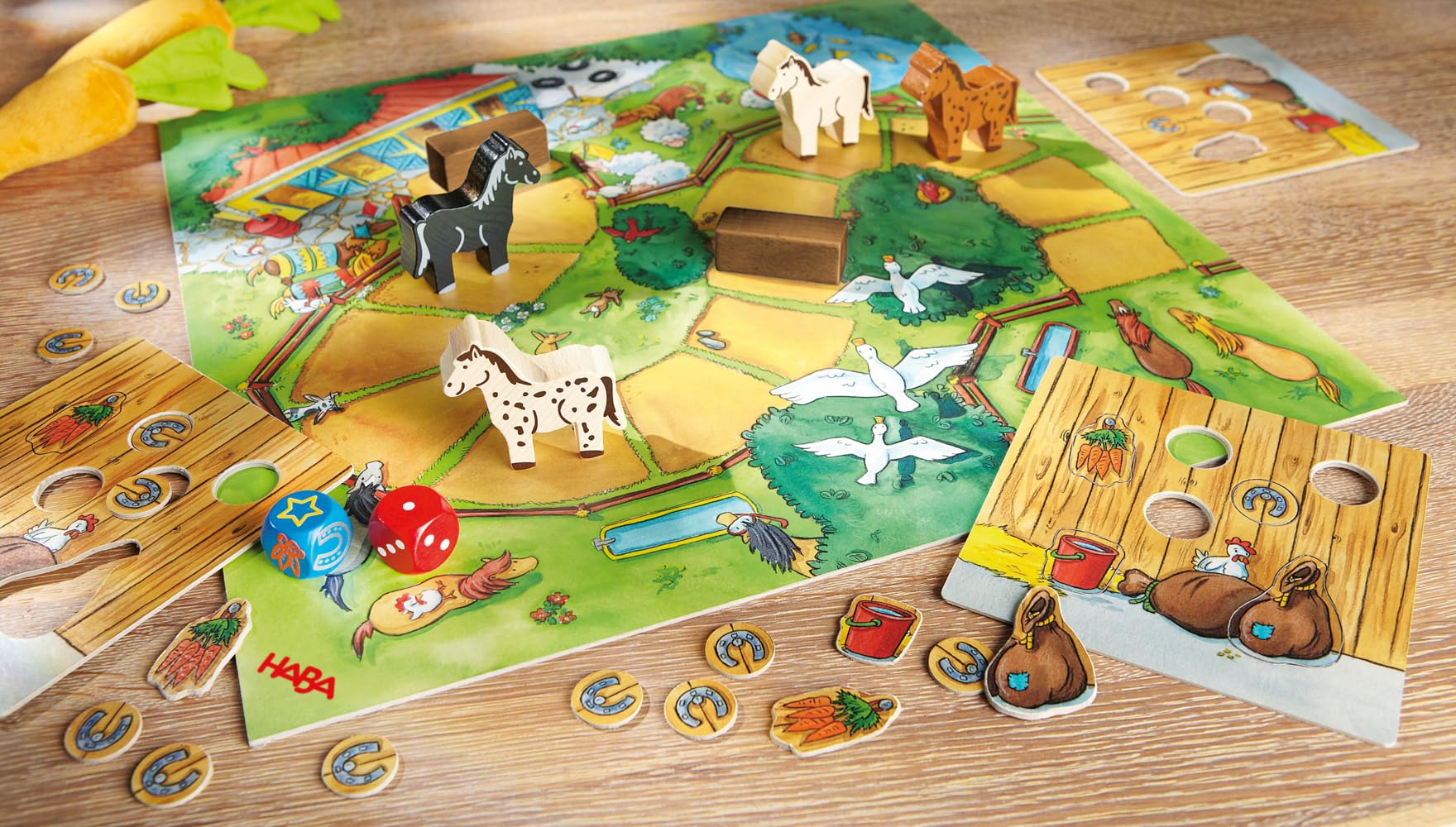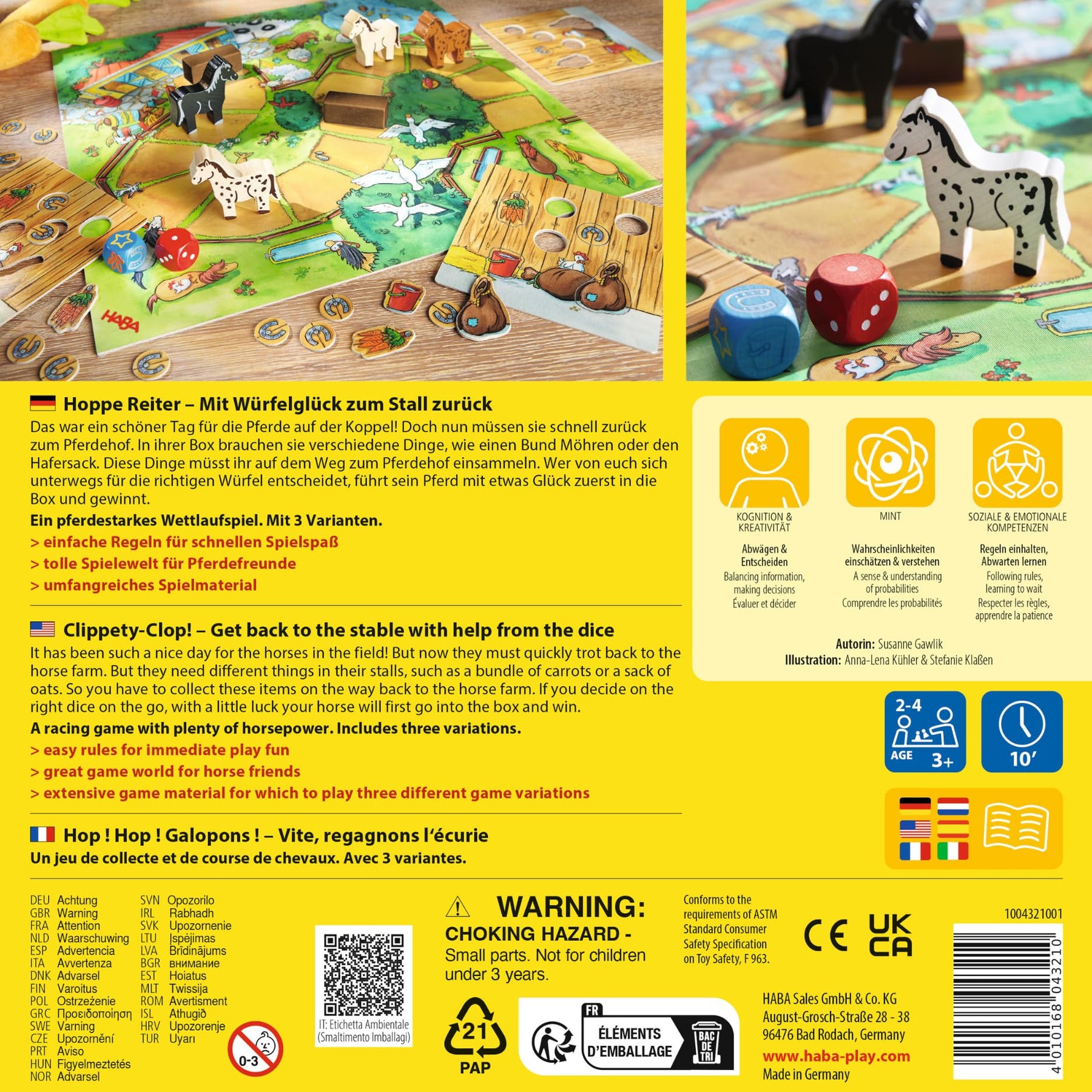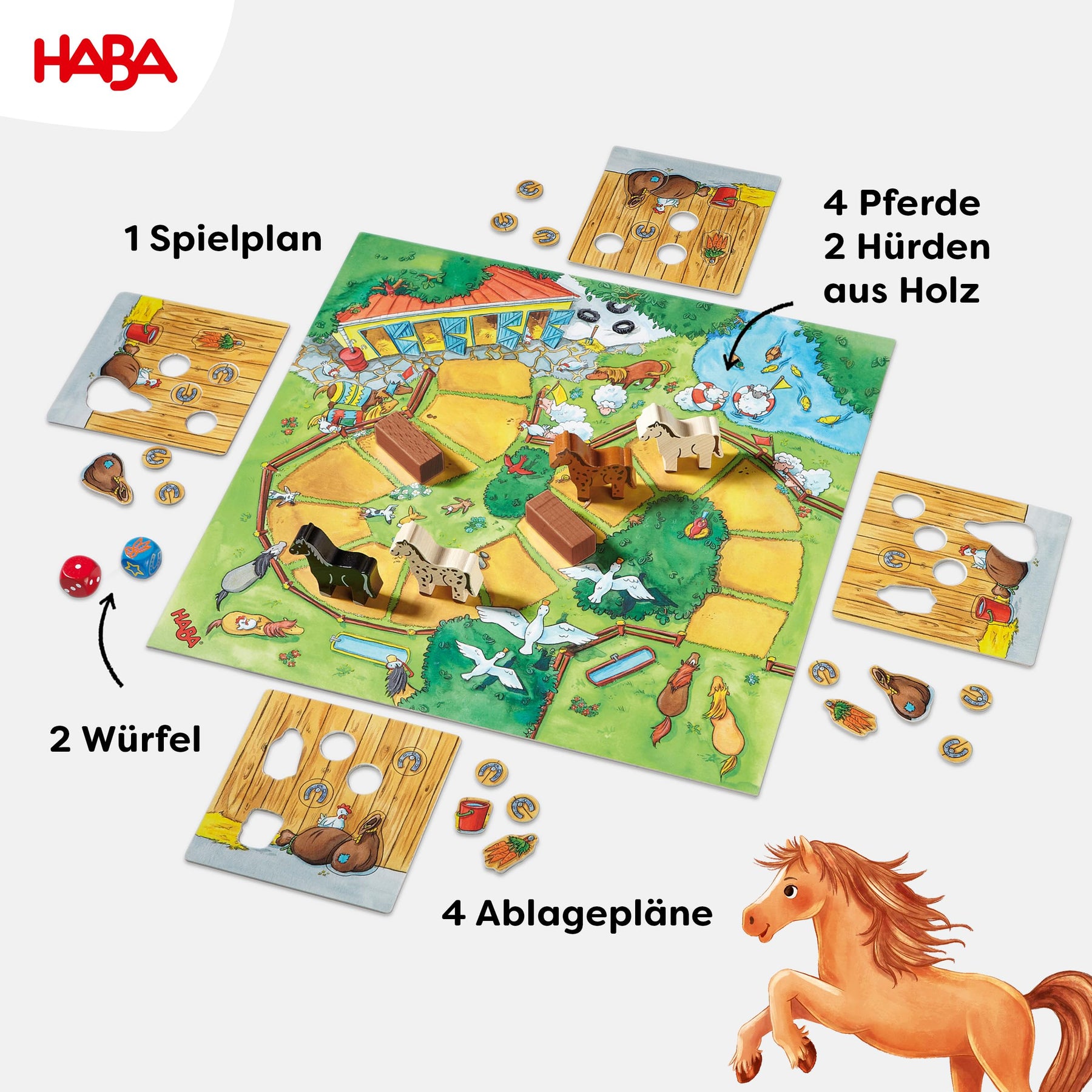 Hoppe Reiter ist ein pferdestarkes HABA-Wettlaufspiel für kleine Pferdefans. Für die Pferde war es ein schöner Tag auf der Koppel! Doch nun müssen sie schnell zurück auf den Pferdehof. In ihrer Box fehlen aber noch verschiedene Dinge, wie z. B. ein Bund Möhren oder ein Hafersack. Diese und weitere Utensilien müssen die Spieler unterwegs einsammeln, bevor sie mit ihrem Pferd den Hof erreichen. Zwei Würfel zeigen an, welche Dinge gesammelt werden dürfen bzw. um wie viele Felder das Pferd weitergezogen werden darf. Wer sich unterwegs für die richtigen Würfel entscheidet, wird sein Pferd mit etwas Glück als Erster in die Box führen. Dieses spannende Wettlauf-Spiel fördert ein erstes Regelverständnis und unterstützt die Entwicklung der Entscheidungsfähigkeit, da unter Abwägung zweier Alternativen eine Entscheidung getroffen werden muss. Das HABA-Spiel Hoppe Reiter bietet zudem viel Abwechslung, da es in drei Varianten gespielt werden kann.
