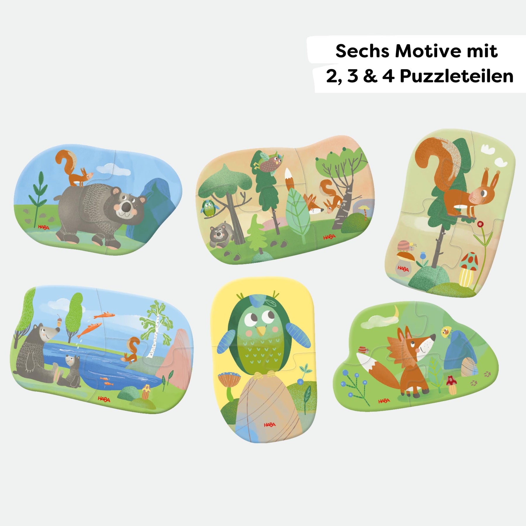 - NATURMOTIVE: Die Puzzles zeigen detailreich Eule, Eichhörnchen, Bär und Fuchs, die Kinder auf spannende Abenteuer durch den Wald mitnehmen.