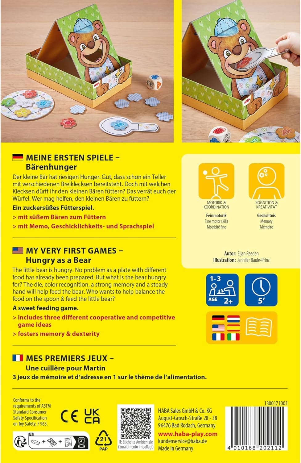 HABA Meine ersten Spiele: Bärenhunger – Kinderspiel für 1-3 Spieler – Das Memospiel fördert Feinmotorik und Sprache – Ab 2 Jahren – 1300171001