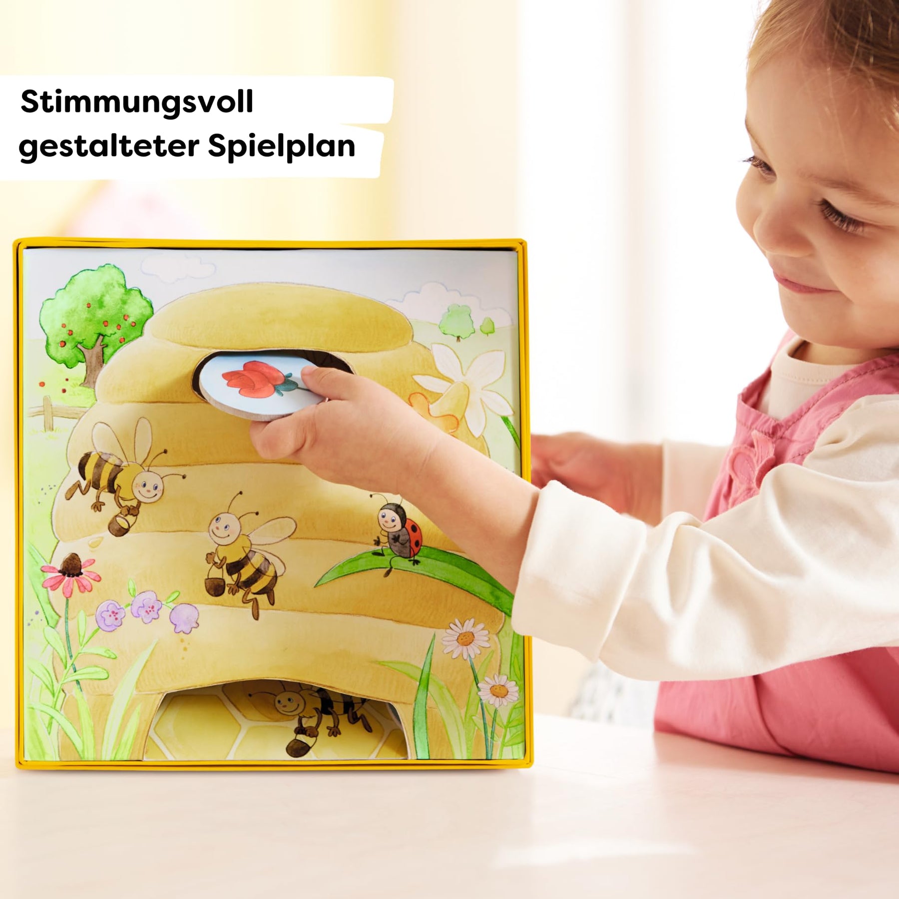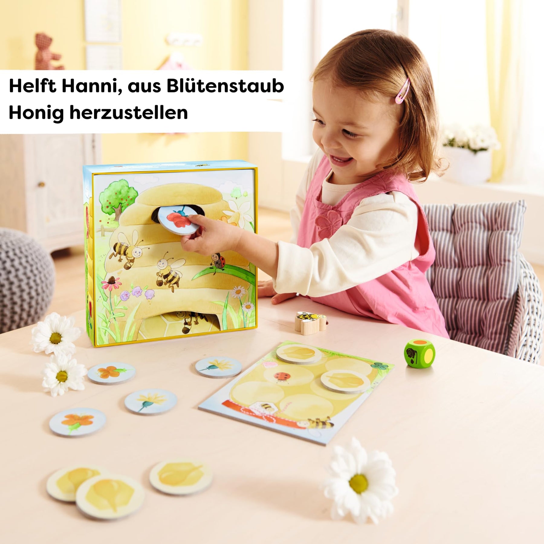 Hanni Honigbiene fliegt über die bunten Blumenwiesen. Wie es sich für eine fleißige Biene gehört, sammelt sie dabei natürlich kräftig Nektar ein, um ihn zum Bienenstock zu bringen. Dort warten Hannis Freunde, um daraus leckeren süßen Honig zu machen. Wer hilft Hanni Honigbiene dabei, so viel Honig herzustellen, dass das ganze Honigglas voll wird?