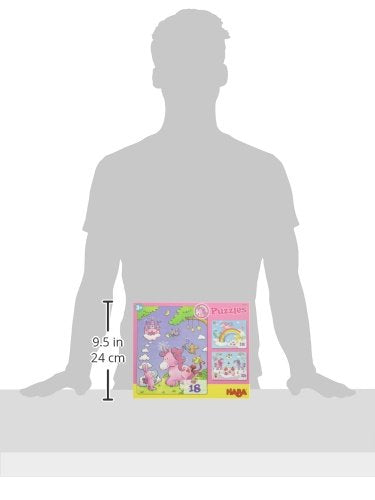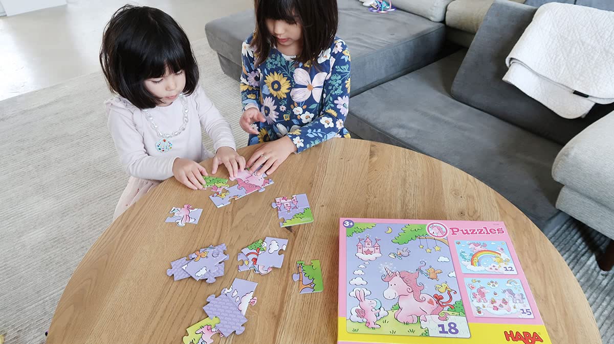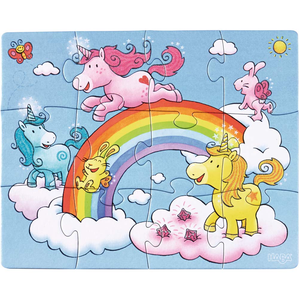 Es gibt Neues aus dem Wolkenland! Die HABA-Puzzles Einhorn Glitzerglück bringen die süßen Einhörner aus dem beliebten und gleichnamigen HABA-Mitbringspiel zurück ins Kinderzimmer. Schon die glitzernde Verpackung lässt Vorfreude aufkommen. Für fabelhaften Puzzle-Spaß sorgen dann drei wunderschön illustrierten Motive, die ebenfalls glitzern. Sie zeigen Glitzerglück beim Galopp über den Regenbogen, beim fröhlichen Picknick in den Wolken und beim abendlichen Plausch mit dem rosa Häschen. Auch mit den Einhornfreunden Sternenstaub, Wunderblume und Zauberherz gibt es ein Wiedersehen. Und dank der unterschiedlichen Anzahl von Teilen reifen Puzzle-Neulinge mit den HABA-Puzzles Einhorn Glitzerglück rasch zu echten Profis heran.