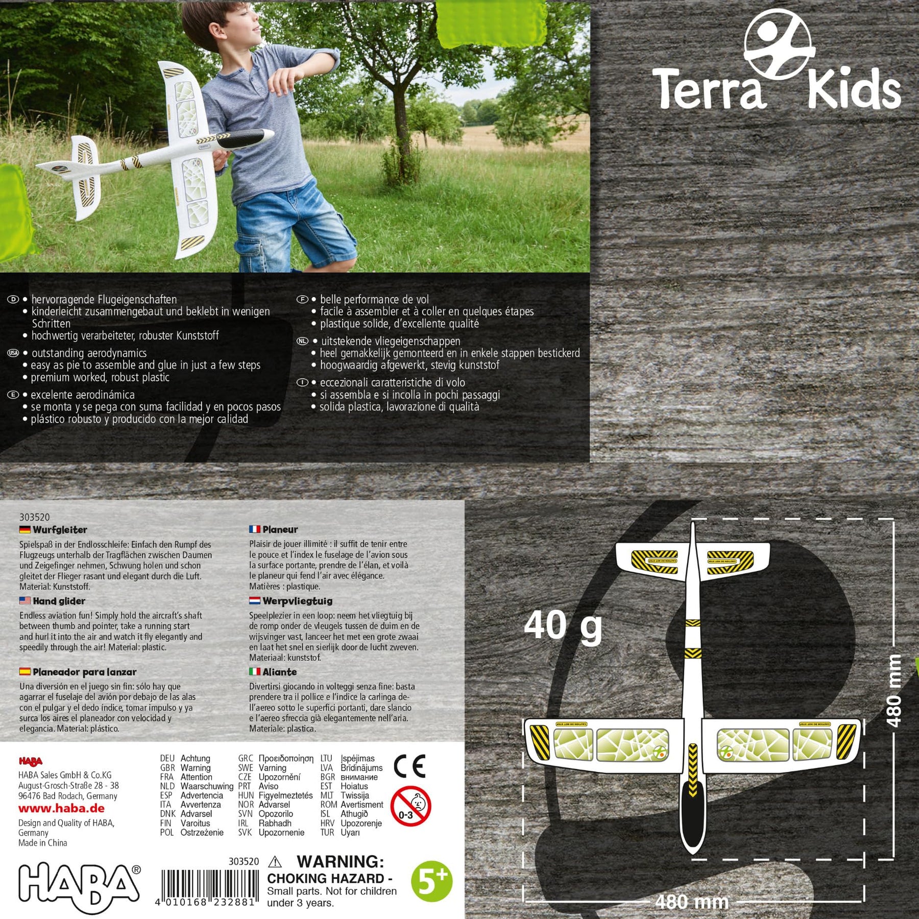 Mit dem Terra Kids Wurfgleiter von HABA heben kleine Pilot:innen ab in spannende Flugabenteuer! Das robuste Gleitflugzeug aus leichtem Styropor ist in wenigen Schritten zusammengebaut und begeistert mit hervorragenden Flugeigenschaften. Einfach greifen, Schwung holen und losschleudern – schon saust der Flieger elegant durch die Luft. Ideal für Ausflüge in den Garten, den Park oder auf die Wiese und perfekt, um Geschicklichkeit, Bewegung und Koordination zu fördern. Ein actionreicher Spaß für Kinder ab 5 Jahren!