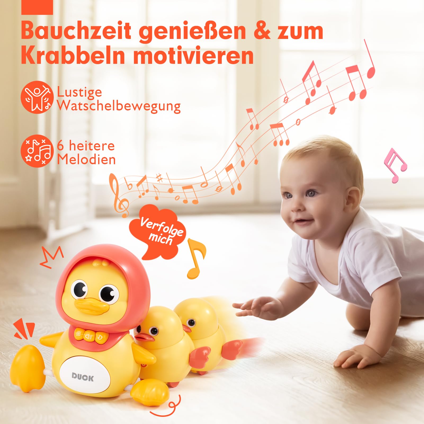 - â€ïžăInteressante BewegungăDie kleinen EntenkĂŒken können hinter der Mama-Ente herlaufen oder selbststĂ€ndig watscheln â lustig und niedlich! Sie ermutigen Ihr Baby zum Krabbeln und Laufen, fördern die motorische Koordination und helfen, die BewegungsfĂ€higkeiten zu entwickeln.