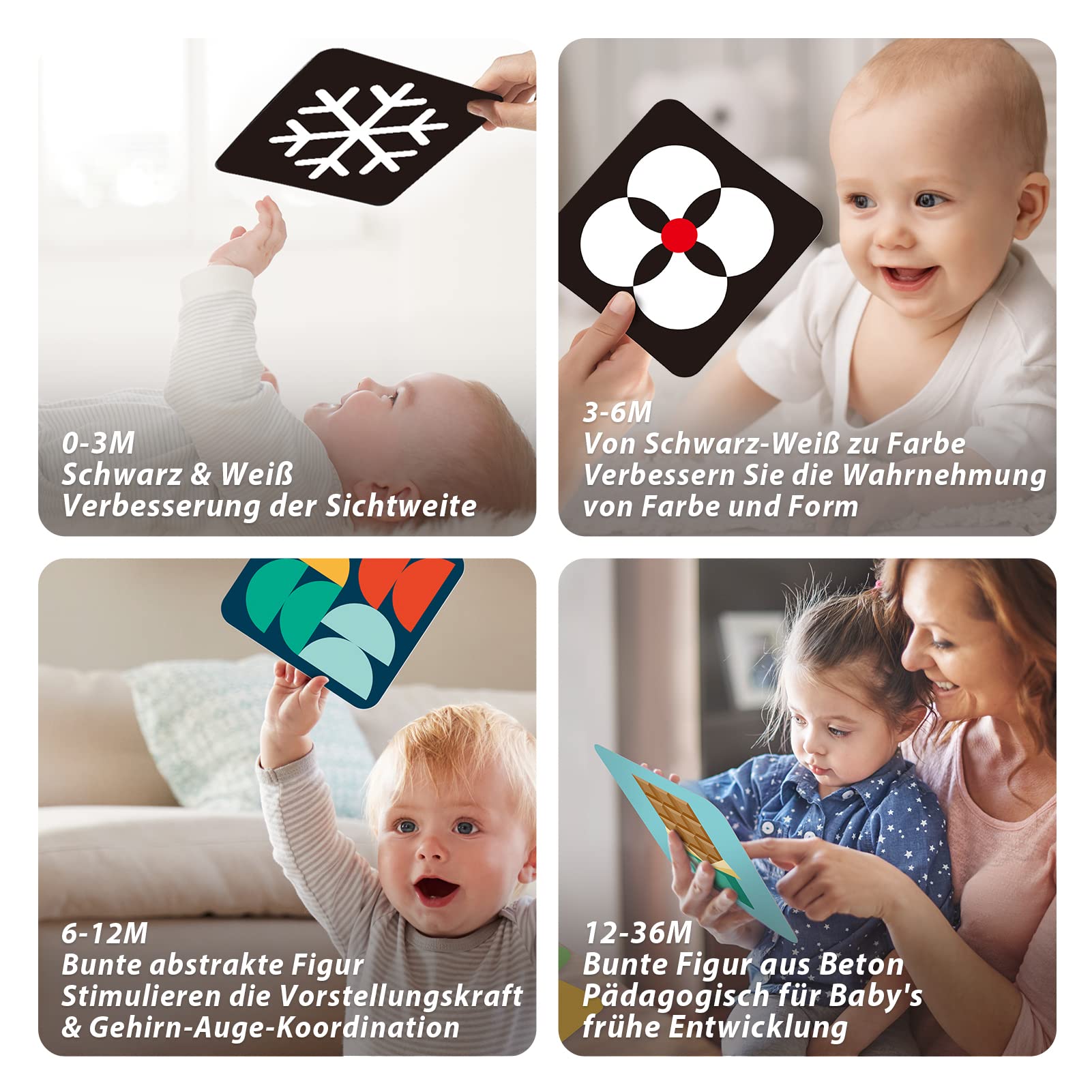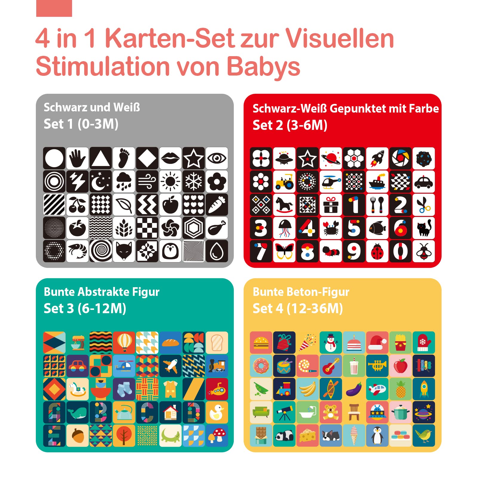 - 【4 Sets für unterschiedliches Alter】Set 1 besteht aus schwarzen, weißen, kontrastreichen Karten zur Verbesserung der visuellen Distanz. Set 2 ist in Schwarz und Weiß mit Grundfarben (rot, gelb, blau) gepunktet, um Baby zu helfen, Farbe um sie herum zu sehen. Set 3 ist abstrakte Stücke mit verschiedenen Farben, um die Phantasie und Gehirn-Augen-Koordination zu stimulieren. Set 4 ist konkrete Objekte mit verschiedenen Farben, um unsere Welt besser zu verstehen.