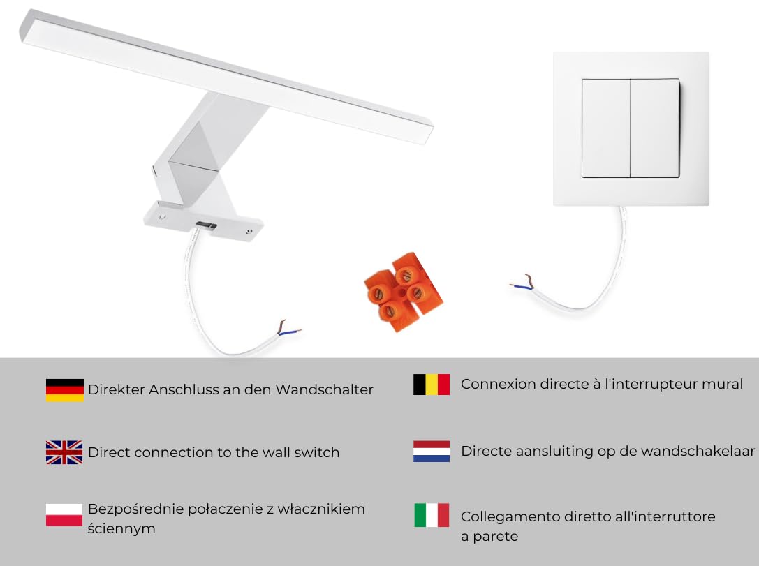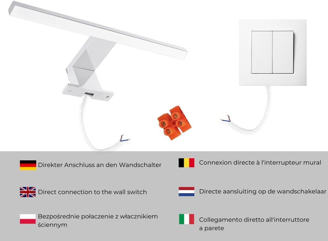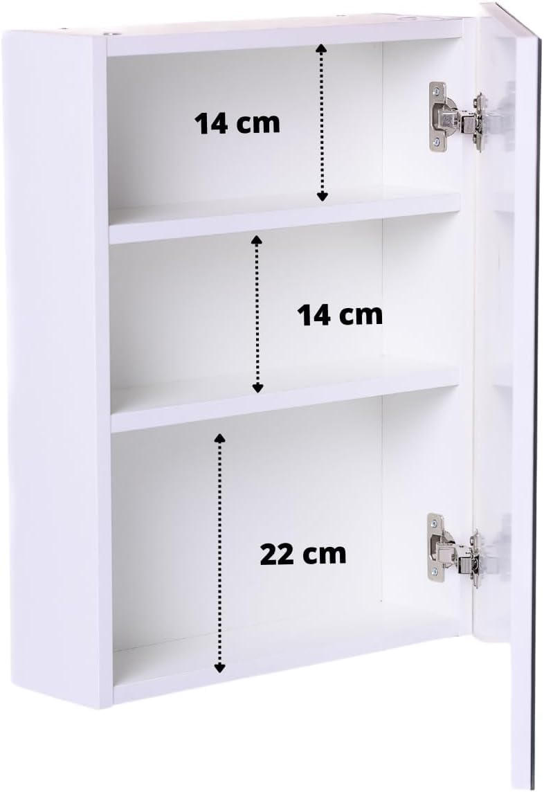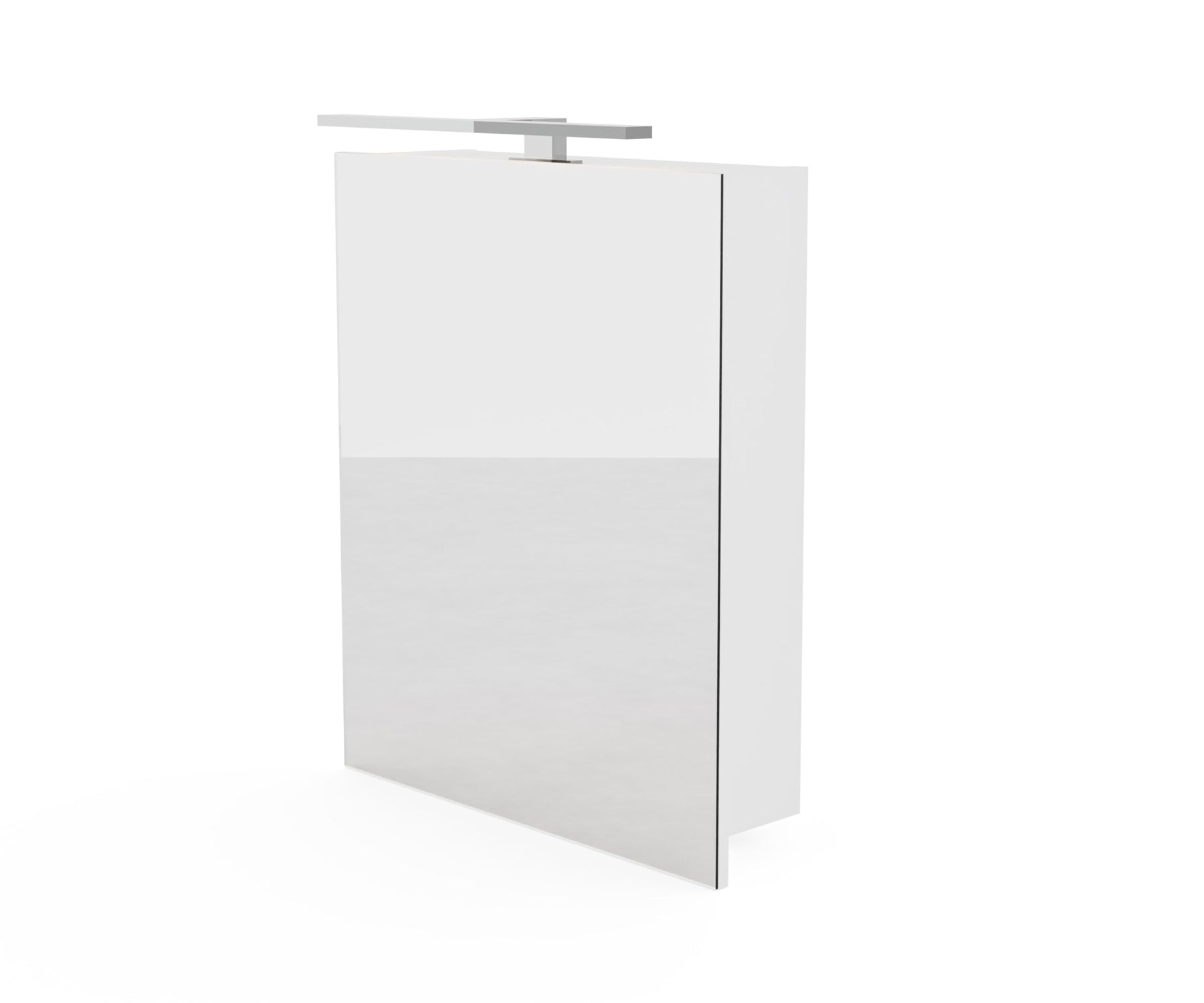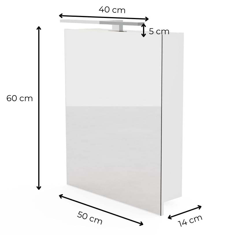 - Spiegelschrank mit Beleuchtung aus laminierter Spanplatte 16 mm in Weiß Matt. Gesamtmaße: B: 50 cm x H:60 cm x T:14 cm. Farbe des LED Gehäuses - Chrom. Farbe des Lichts: neutral 4000K. Lichtstrom [lm]: 250lm. Leistung: 4,5W. Lichtquelle: LED. Netzanschluss: 230V. Kabel: 20 cm. Länge der Lampe: 40 cm