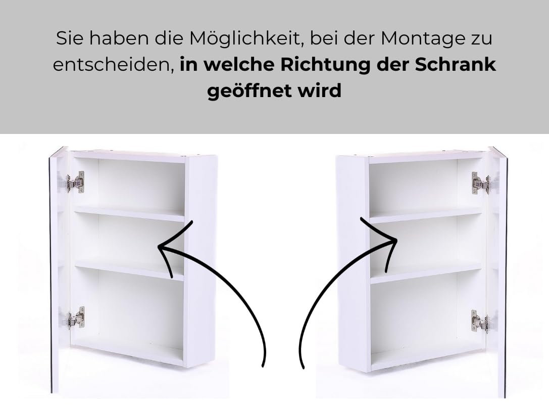 - Die Öffnungsrichtung der Türen von Bad-Schränken ist vom Kunden bei der Installation zu wählen: Die Türen können nach rechts oder nach links geöffnet werden