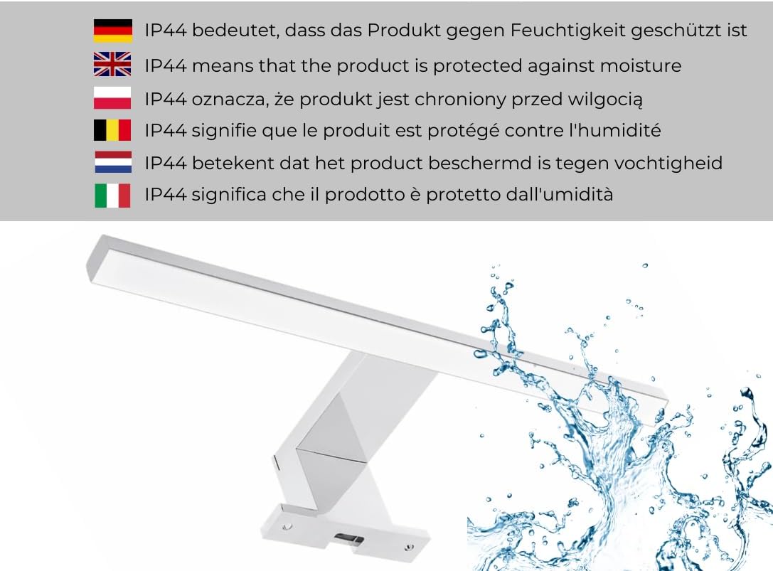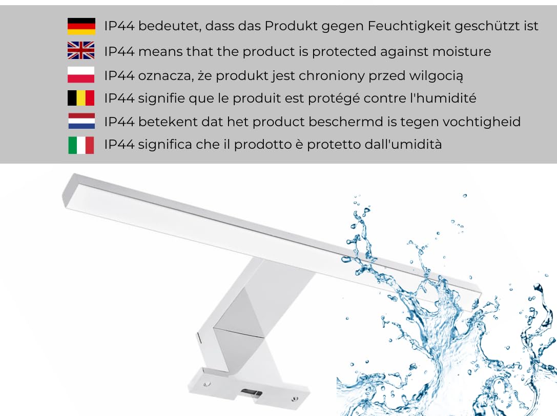 - Einfache Montage gemäß der mitgelieferten Montageanleitung und dem notwendigen Zubehör. Die Lampe hat die Schutzart IP44, was bedeutet, dass dieses Modell gegen Feuchtigkeit geschützt ist