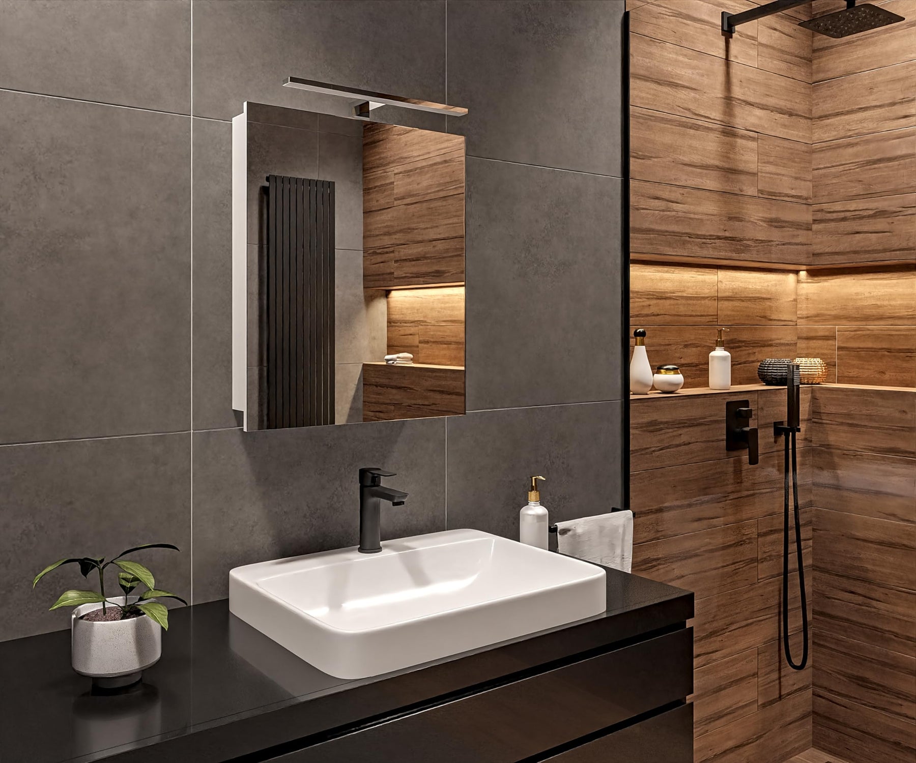 - Die Badezimmer Spiegelschrank mit Beleuchtung ist mit einem 3 mm starken Spiegel in matter Ausführung ausgestattet. Der Spiegelschrank kommt mit einer LED-Aufbauleuchte