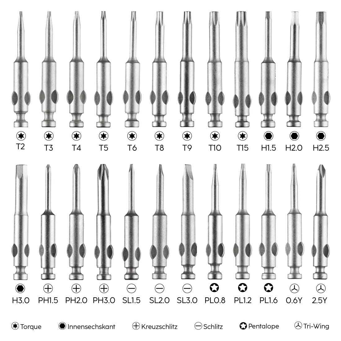 - Aufsätze: 9x Torx (T2-T10, T15) 4x Innensechskant (H1.5, H2.0, H2.5, H3.0) 3x Kreuz (PH1.5, PH 2.0, PH 3.0) 3x Schlitz (SL1.5, SL2.0 SL3.0) 3x Pentalobe (PL0.8, PL1.2, PL1.6) 2x Tri-Wing (0.6Y, 2.5Y)