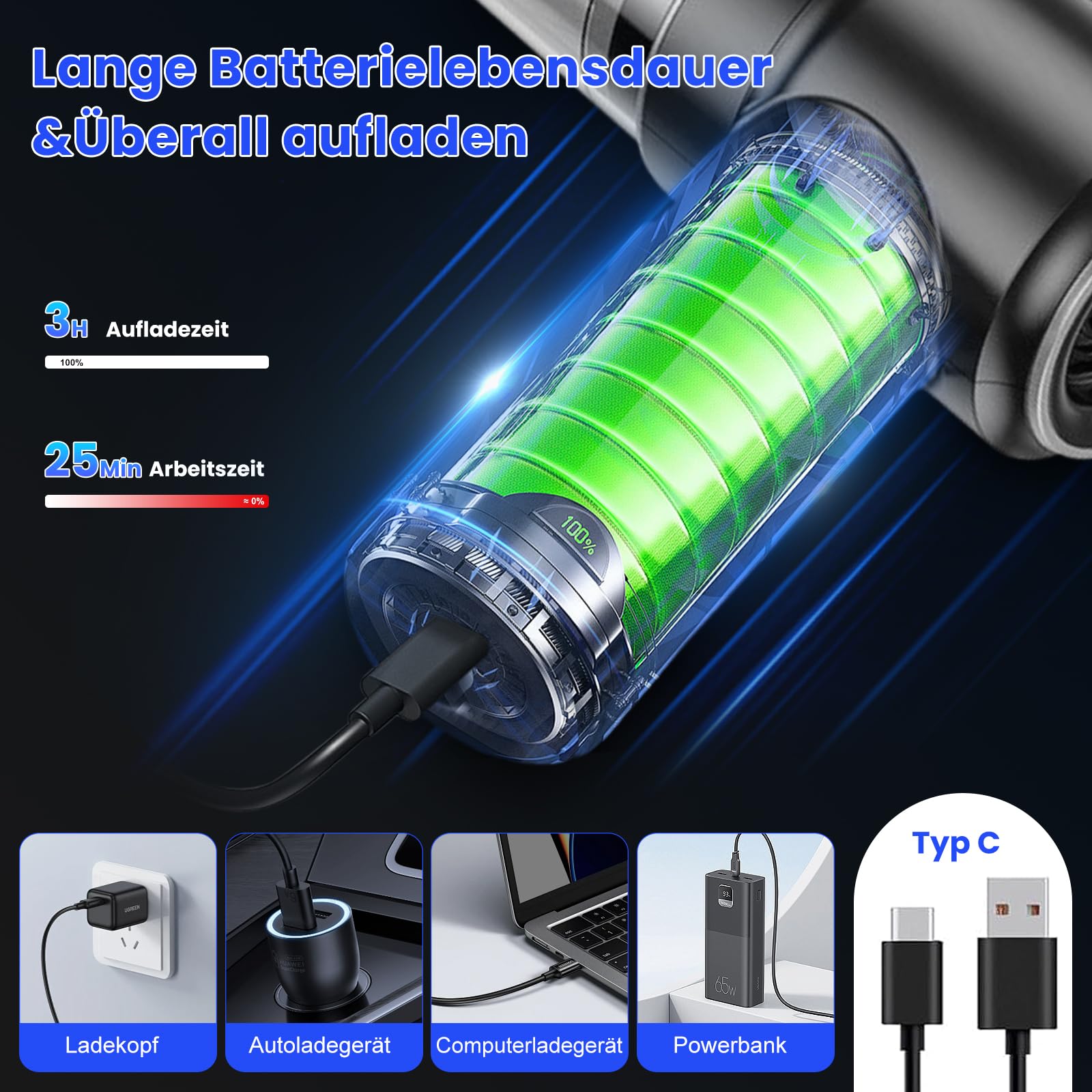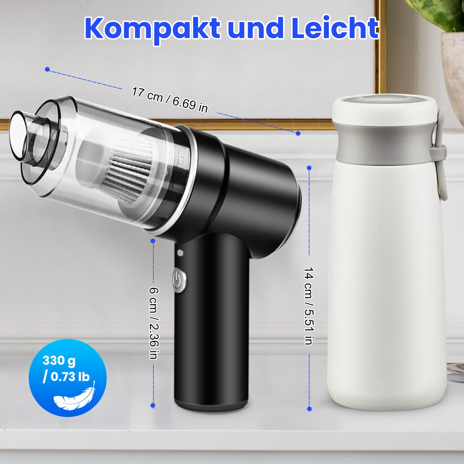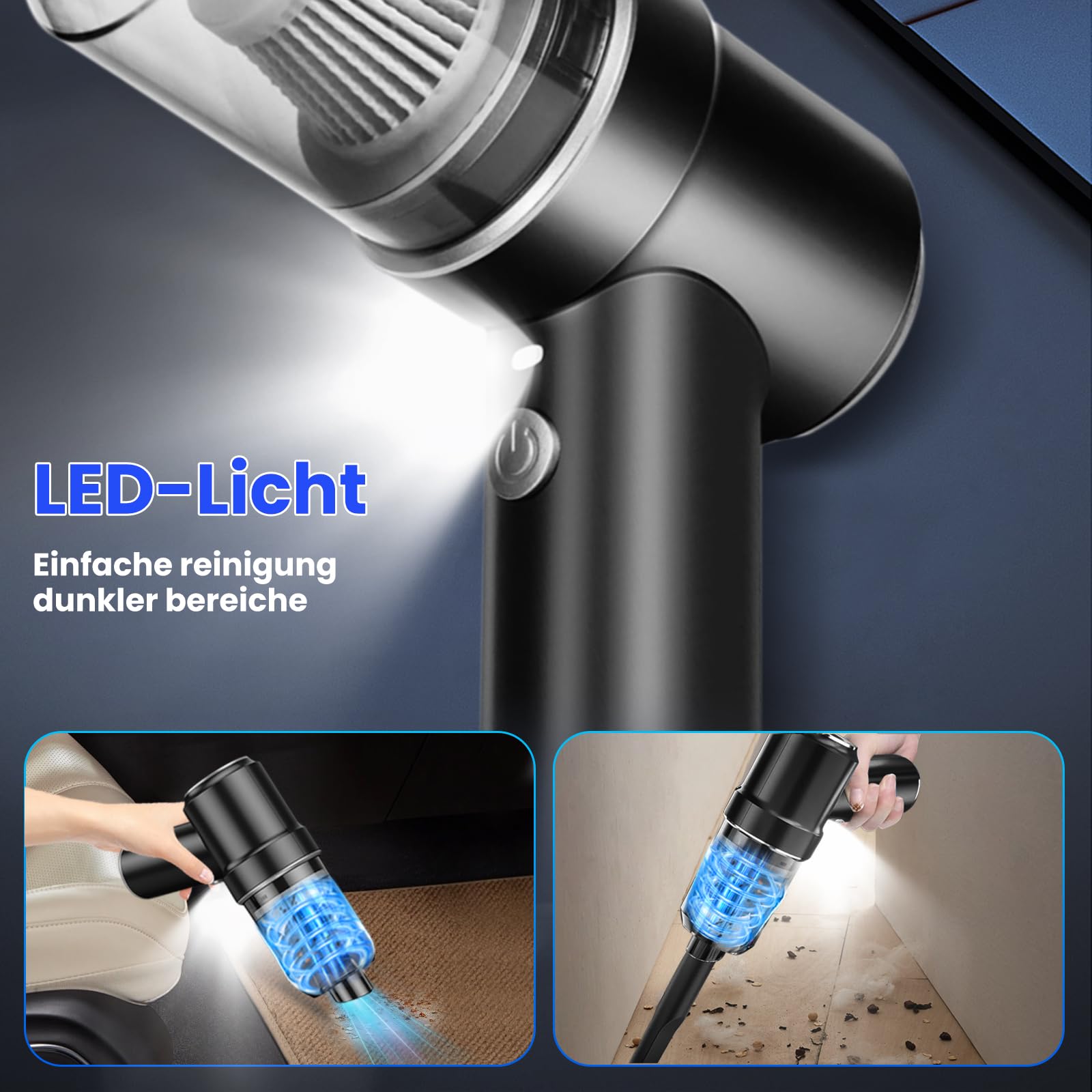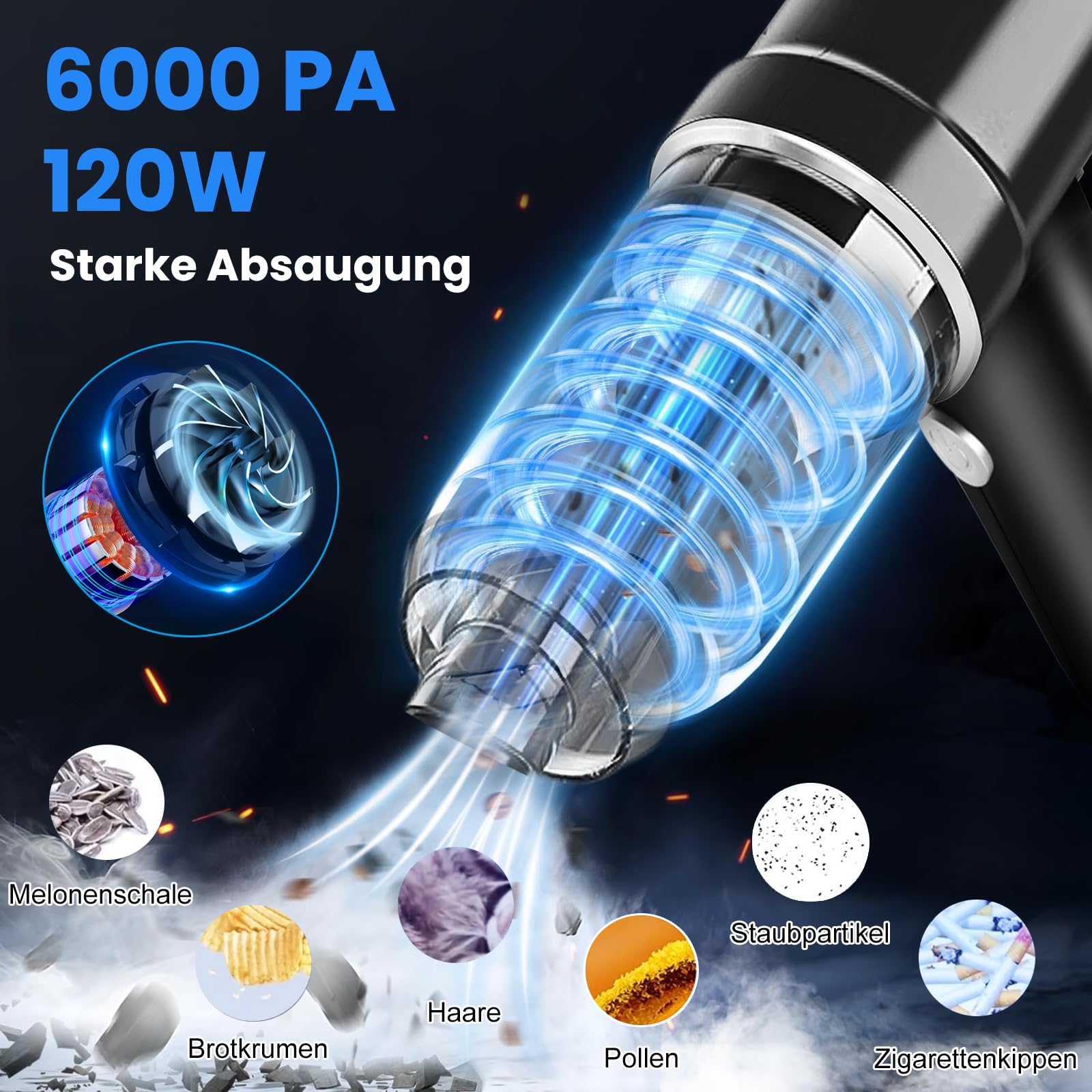 - 6000PA Hyper-Saugkraft: Der tragbare Handstaubsauger ist mit einem leistungsstarken bürstenlosen 120W-Motor ausgestattet, der eine starke Saugkraft von bis zu 6000 PA bietet, was die Reinigung zu einem Kinderspiel macht und zur Reinigung von Staub, Schmutz und Tierhaaren in Autos, Sofas, Wänden, Treppen und anderen schwer zugänglichen Stellen verwendet wird.