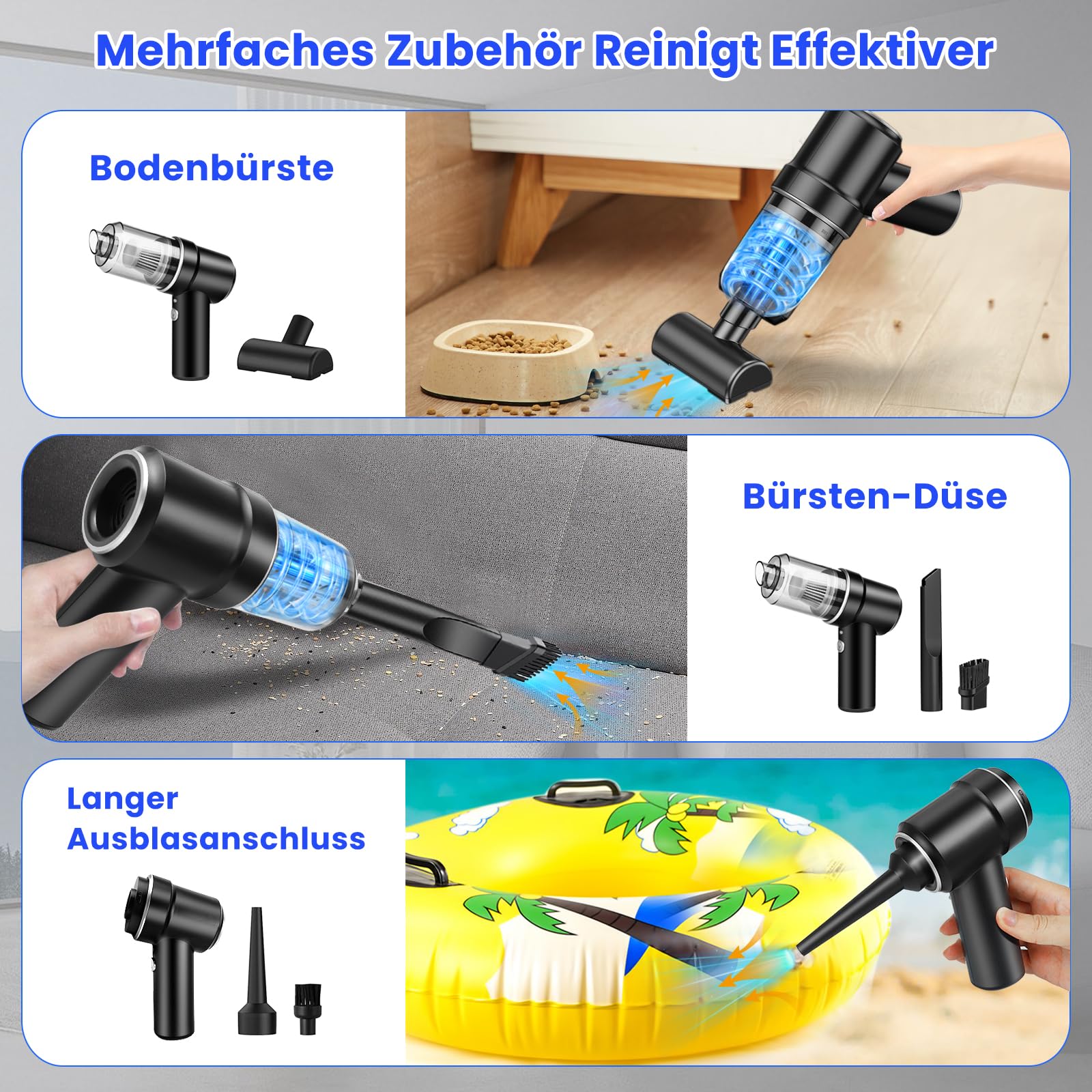 - Multifunktionale Aufsätze: Dieser handliche Handstaubsauger verfügt über umfangreiches praktisches Zubehör, darunter eine Saugdüse, eine Bodenbürste, eine Blasdüse und Bürstendüsen. Ein Ende saugt und das andere Ende bläst, die Kombination der Aufsätze kann alle täglichen Reinigungsanforderungen von Fahrzeugen und Wohnungen erfüllen.