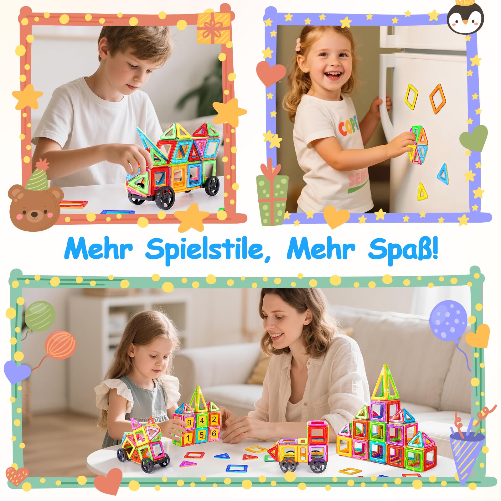 - 【Das beste Geschenk für Kinder】Magnetische bausteine, geeignet für Jungen und Mädchen im Alter von 3, 4, 5 und 6 Jahren als Geschenk zum Geburtstag, zu Weihnachten und anderen Feierlichkeiten. Es ist ein großartiges Spielzeug, um mit Freunden oder Eltern zu spielen, da es die Kommunikation und Zusammenarbeit fördert und Beziehungen stärkt.