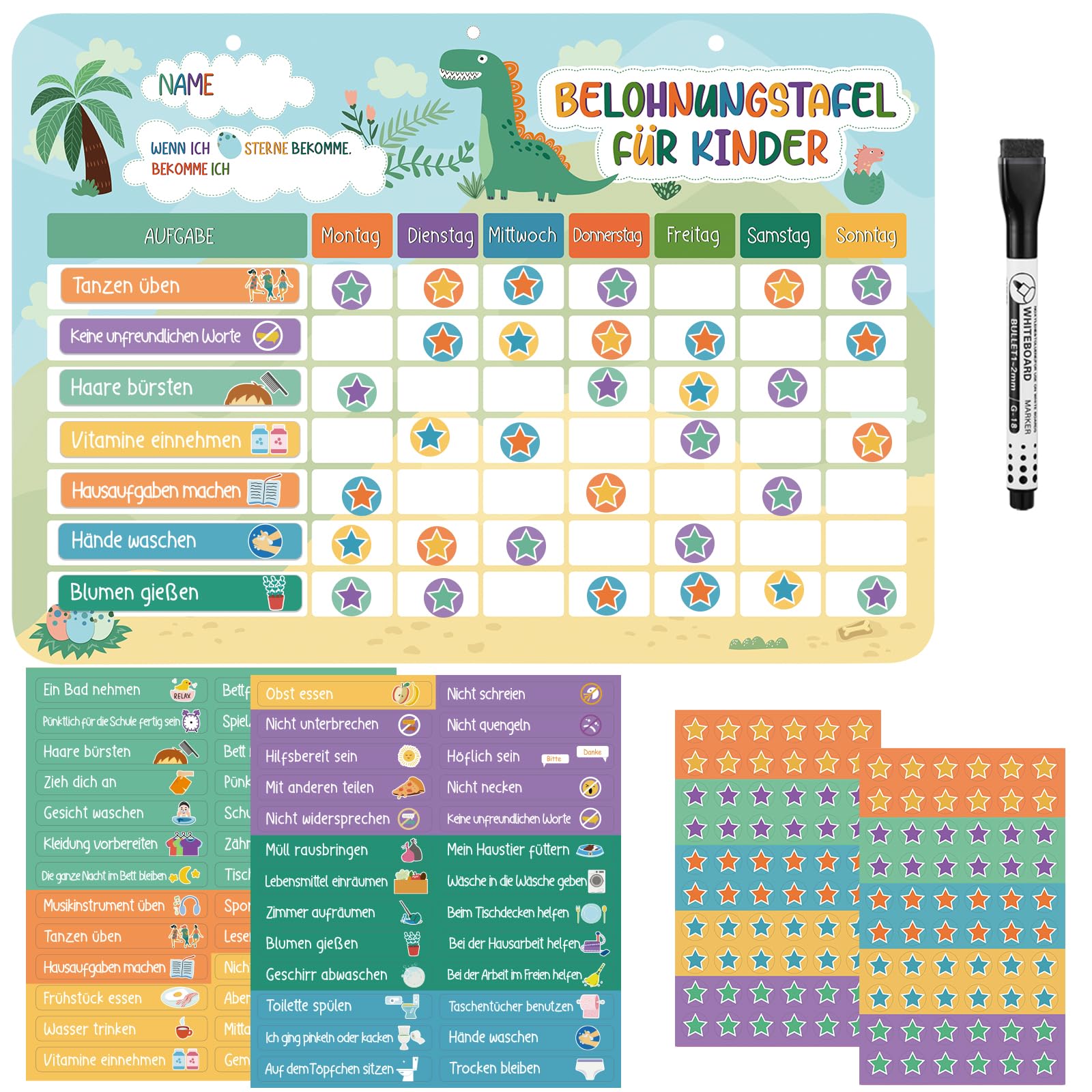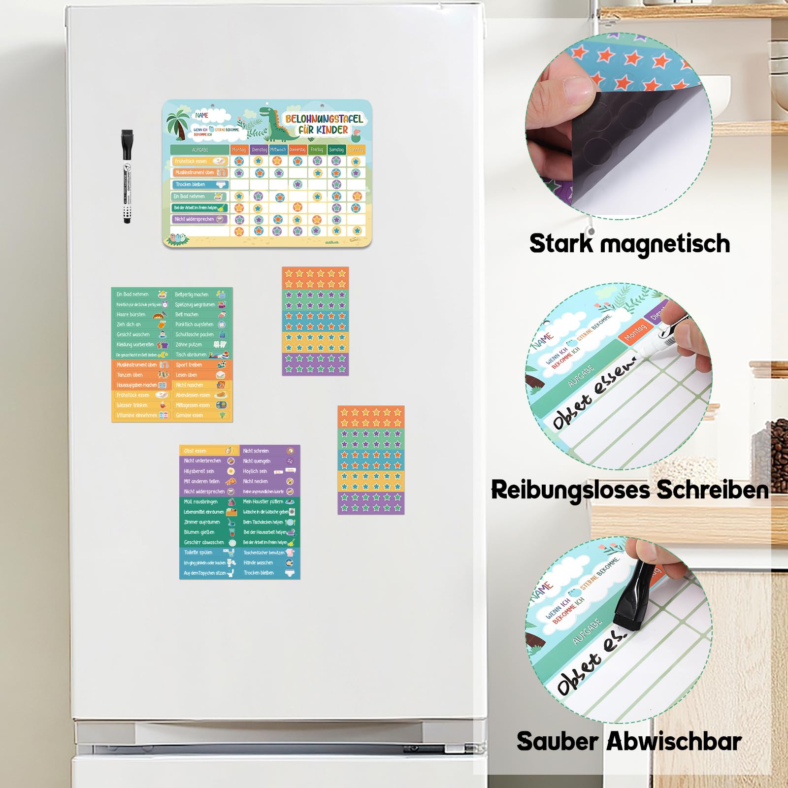 - 【Alles Magnetisch】Dieses Set enthält 1 Belohnungstafel für Kinder, 1 Marker Abwischbar, 52 Aufgaben Magnete und 120 Sternmagneten. Alle hat magnetische Absorption und kann auf Eisenoberflächen wie Kühlschränke adsorbiert werden, was sehr bequem zu verwenden ist.